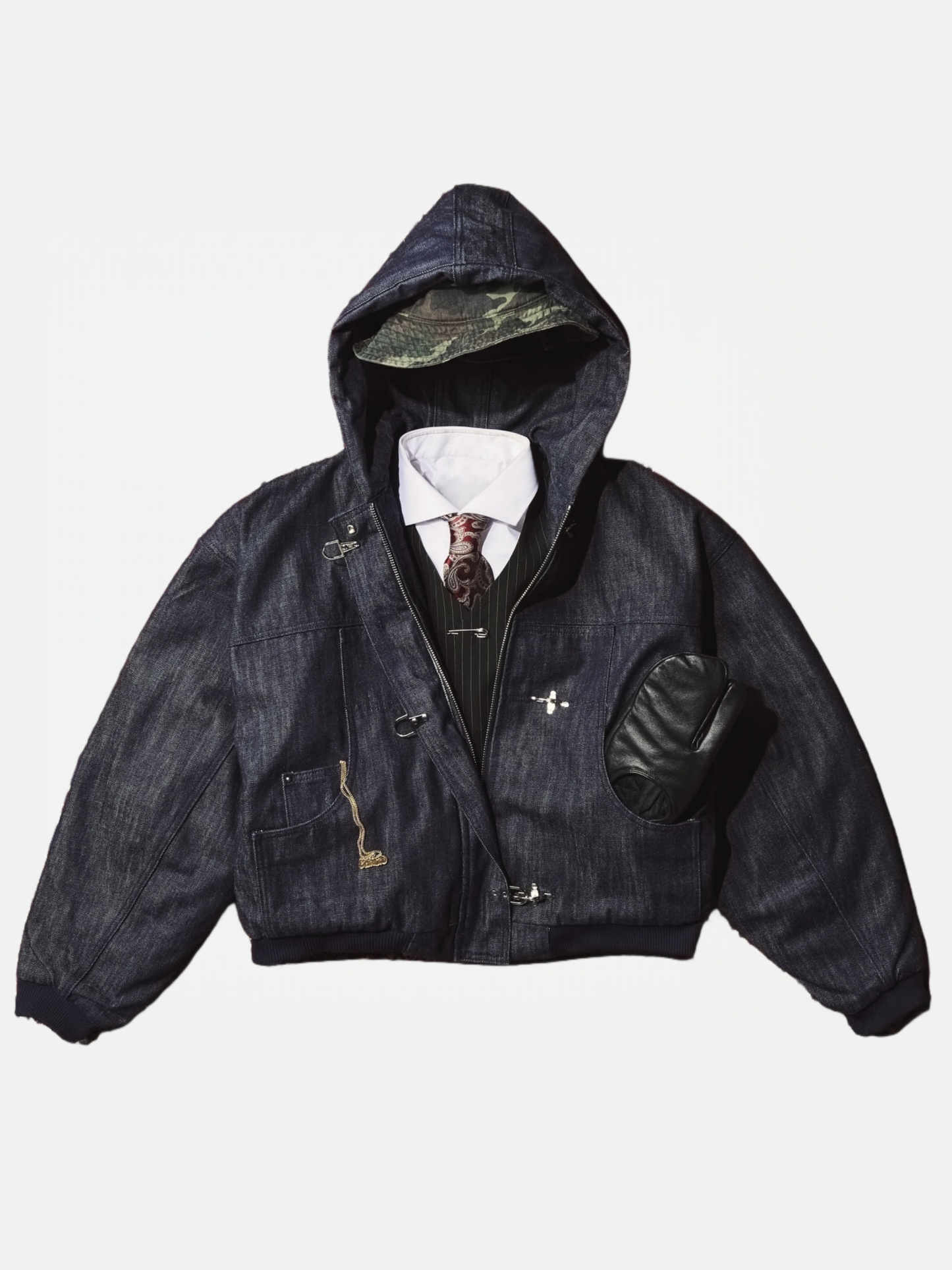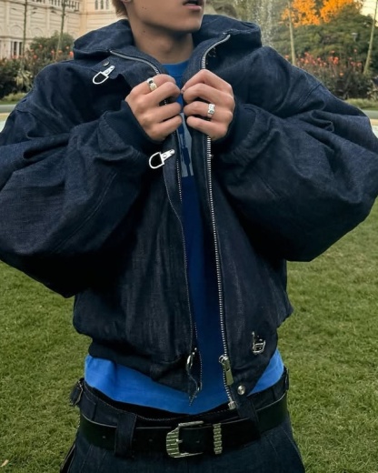 The 15oz Raw Denim Clasp Bomber Jacket is crafted from raw indigo denim and features a hand-dyed pattern, making each piece uniquely textured and one-of-a-kind. Filled with cotton down and lined with quilted nylon, it offers warmth and comfort, while the oversized cropped fit and heavy-duty metal clasp closure add a modern urban edge. Functional details like the double zip, open-end hip pockets, and bomber-style arm zipper blend utility with style, creating a bold and layered statement piece for the urban explorer who values individuality.
