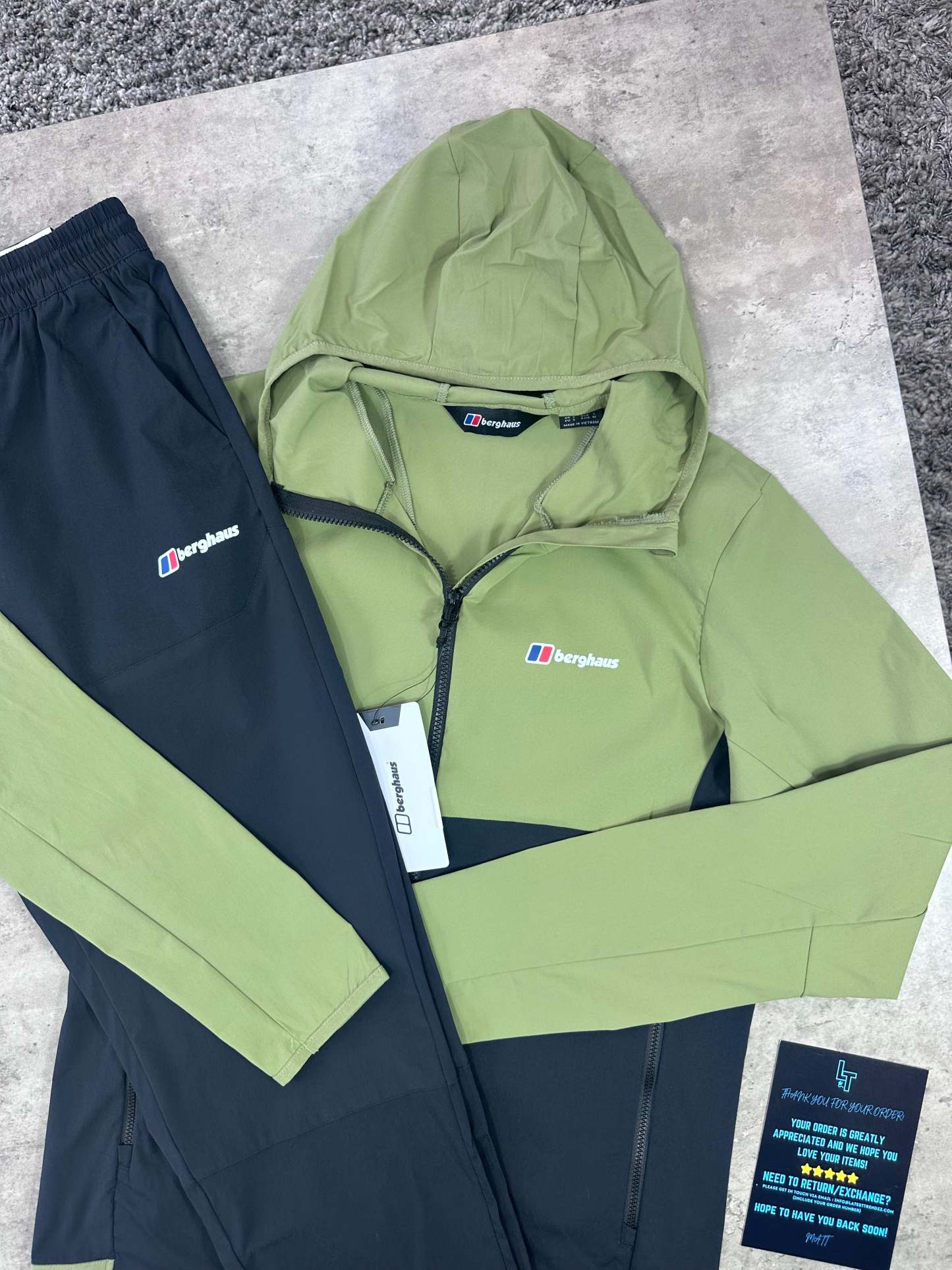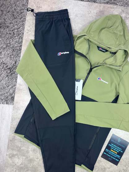This Berghaus Theran Tracksuit in khaki and black offers practical outdoor performance and style. The jacket features a zipper and toggled hood for adjustable protection, along with secure pockets for essentials on the move. The matching Theran+ pants provide a tailored fit with an elasticated, adjustable waistband, multiple pockets including a zip-fastened leg pocket, and open hems for ease of movement. Finished with subtle Berghaus branding, this tracksuit combines functionality and refined design suitable for active wearers seeking dependable outdoor gear.
