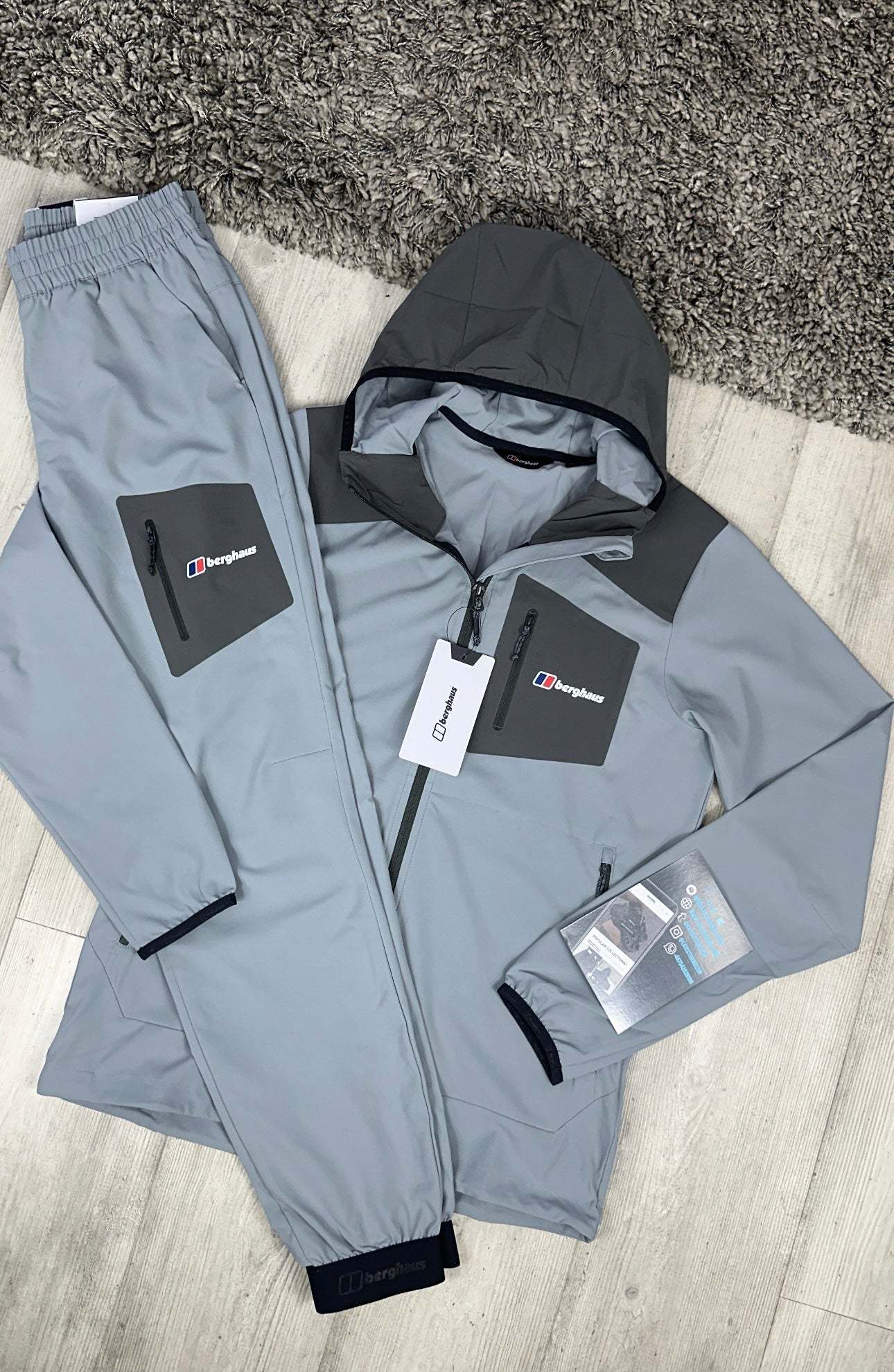 Zip up in this expertly crafted men's Woven tracksuit from Berghaus. Made from lightweight poly fabric in a sleek Granite colourway, this jacket features a full zip, fixed hood, and elasticated trims for ultimate warmth. With reflective details and Berghaus branding, complete the look with matching pants for optimal comfort and performance.