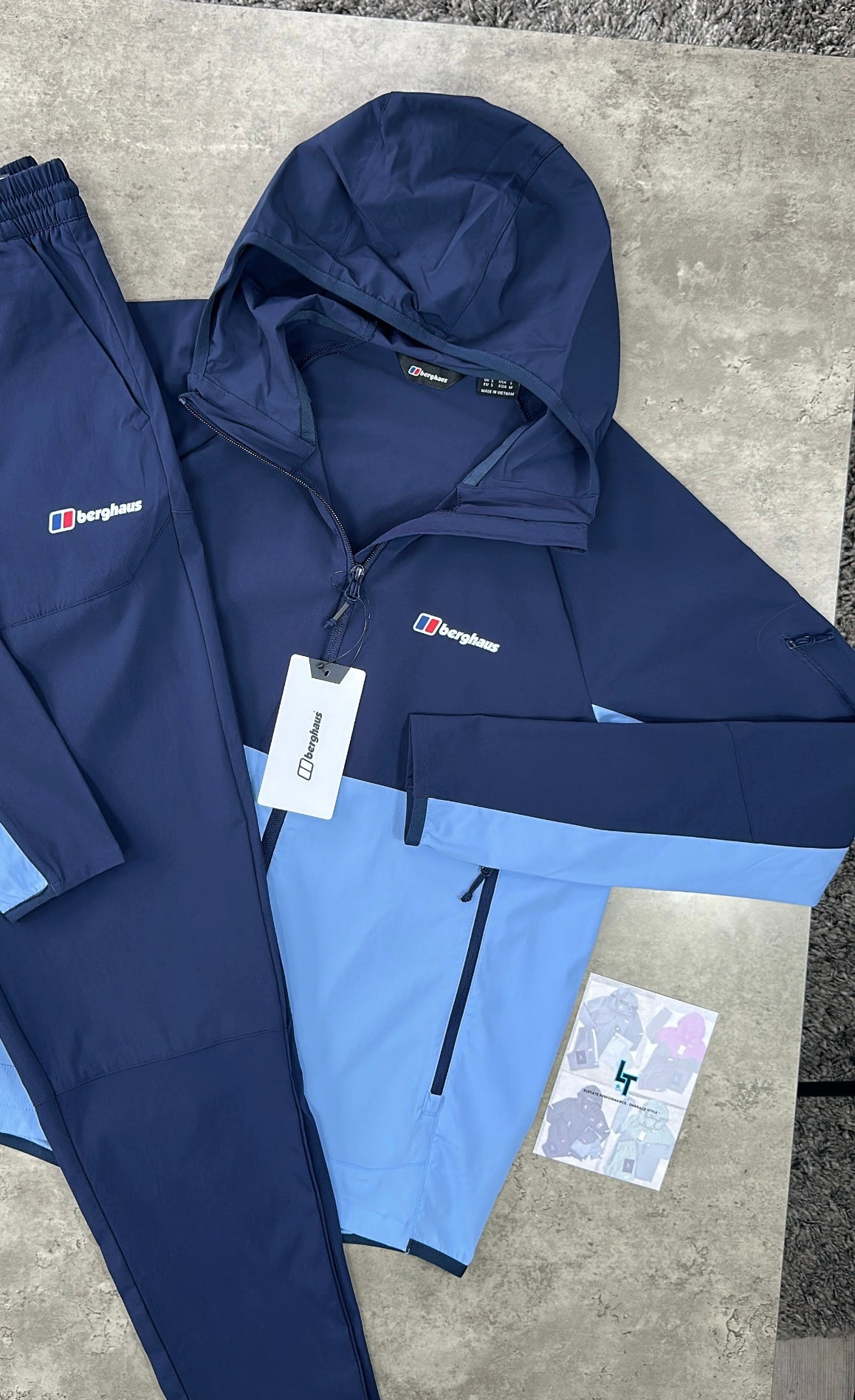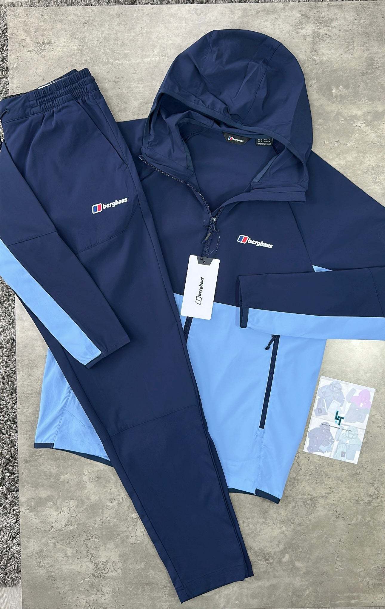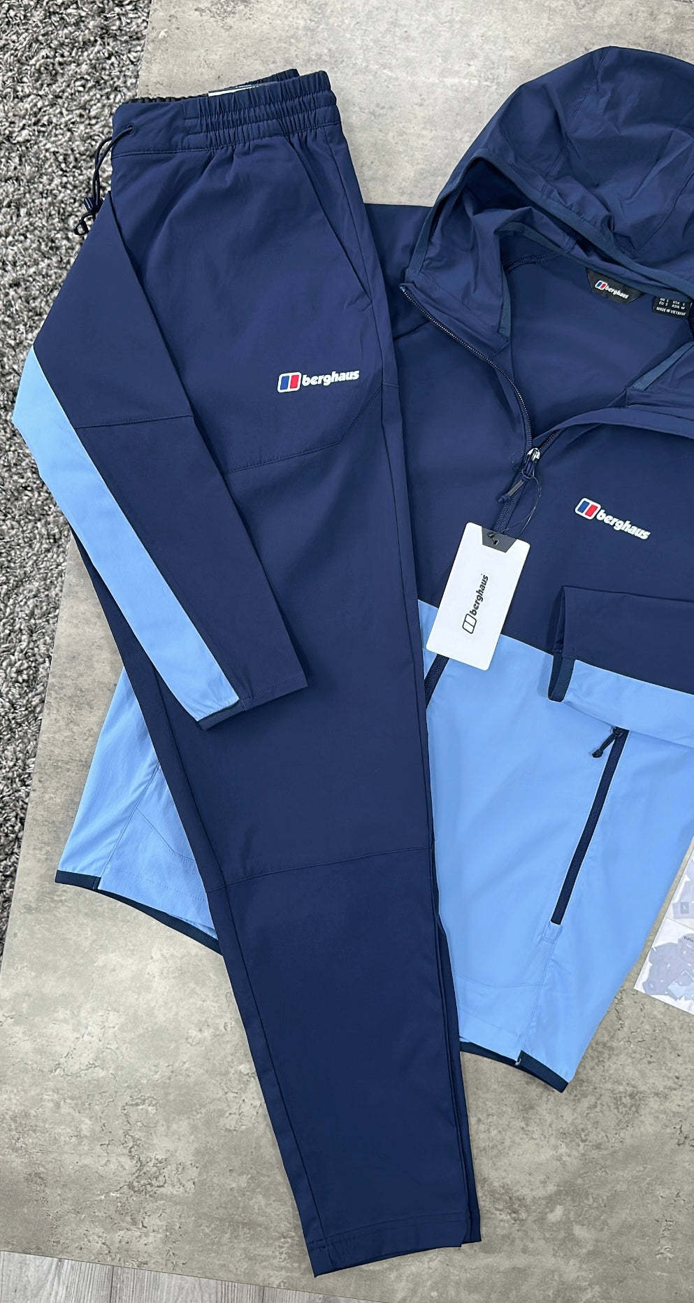 The BERGHAUS TRACKSUIT in navy and sky blue combines outdoor-ready features with everyday comfort. The Theran+ Full Zip Hoodie uses a durable, lightweight fleece that provides warmth without added bulk, perfect for layering during cool weather. Complemented by the Theran+ pants, designed with an elasticated adjustable toggle waistband, this set offers a tailored yet flexible fit ideal for trails, walks, or casual outings. Together, they deliver reliable comfort and functionality for versatile use across varied conditions.