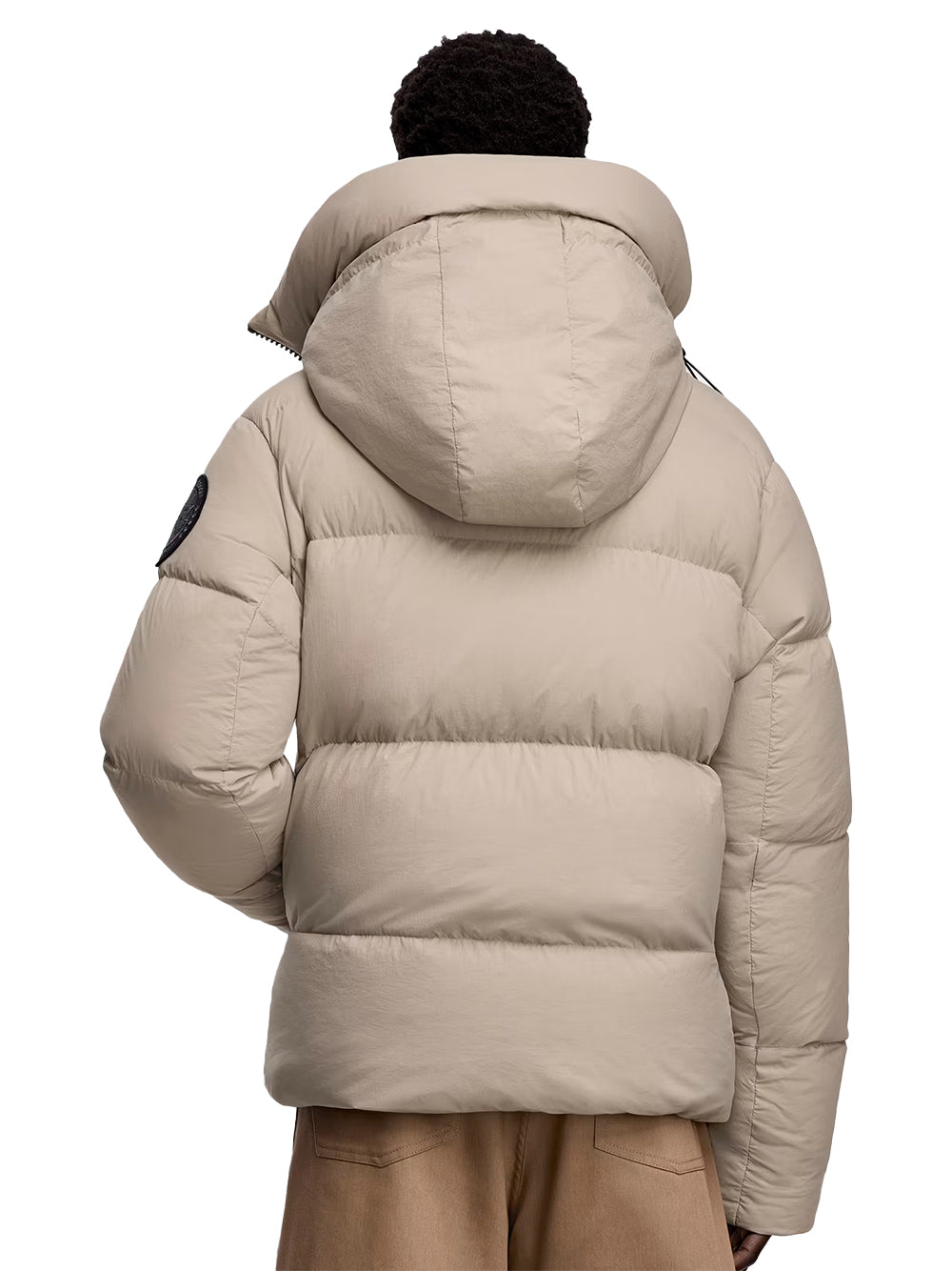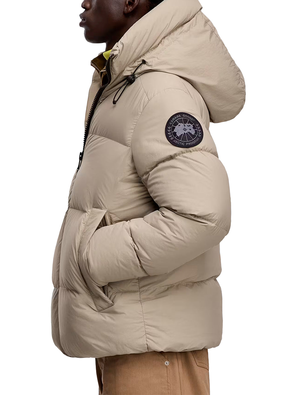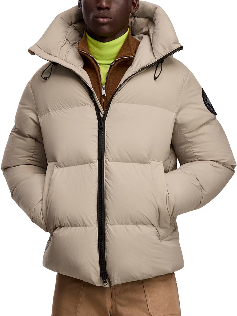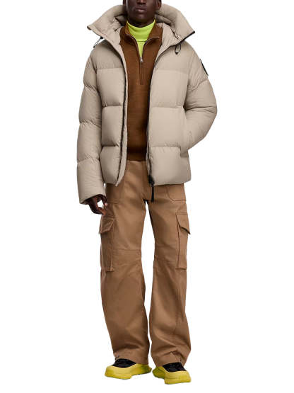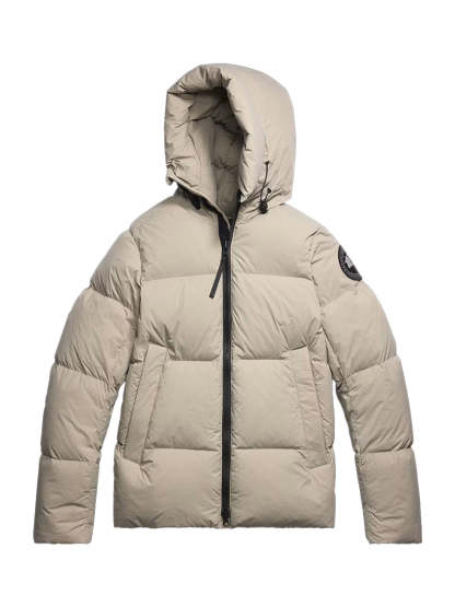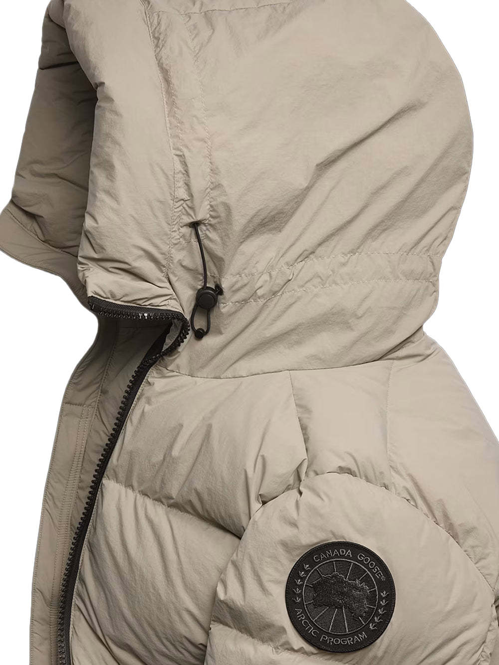 - Down-filled adjustable hood with drawcord