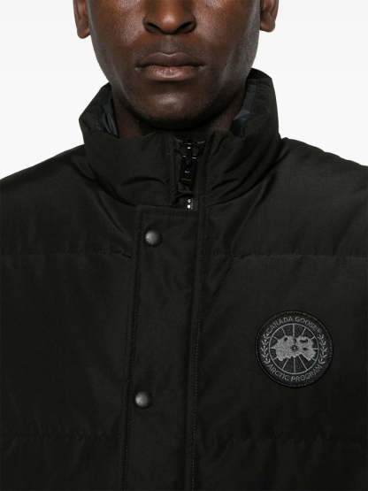 Stay warm with this offering: the Black with quilted shell and down & feather fill. This features snap-button front, dual zip closure, chest logo patch, stand collar, sleeveless design and two secure side flap pockets. Sleek straight hem makes this ideal layering.