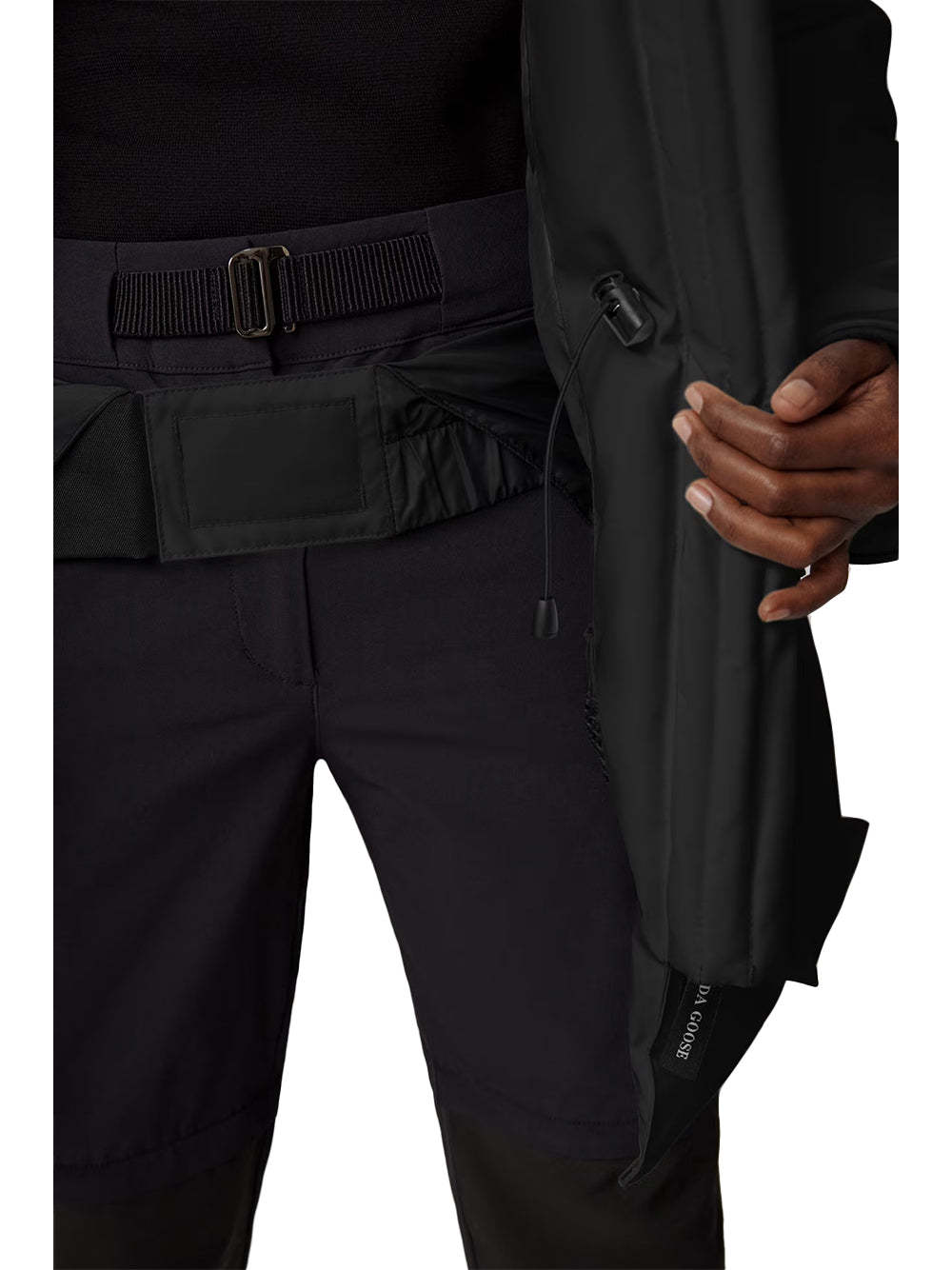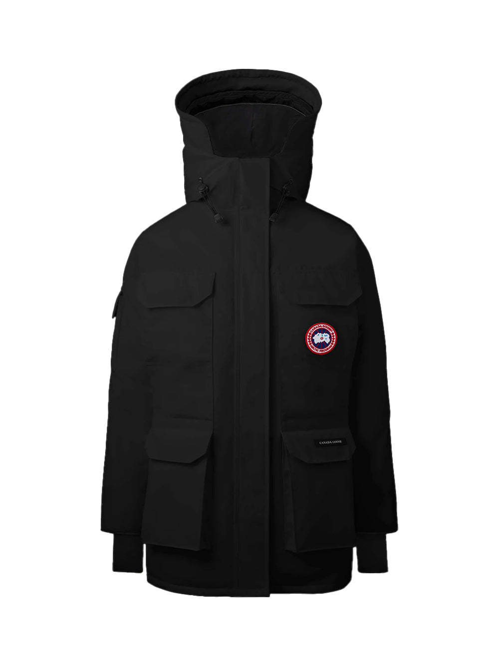The Canada Goose Expedition Parka Black is an oversized and technical with an adjustable down hood and tricot chin guard. As an it adds Expedition webbing, internal waist drawcord and recessed rib cuffs. A-style build and features removable backpack straps, nylon snow skirt and four secure pockets.