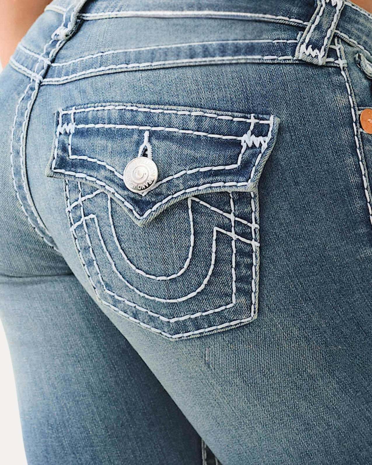 - Light blue faded denim with a soft vintage tone