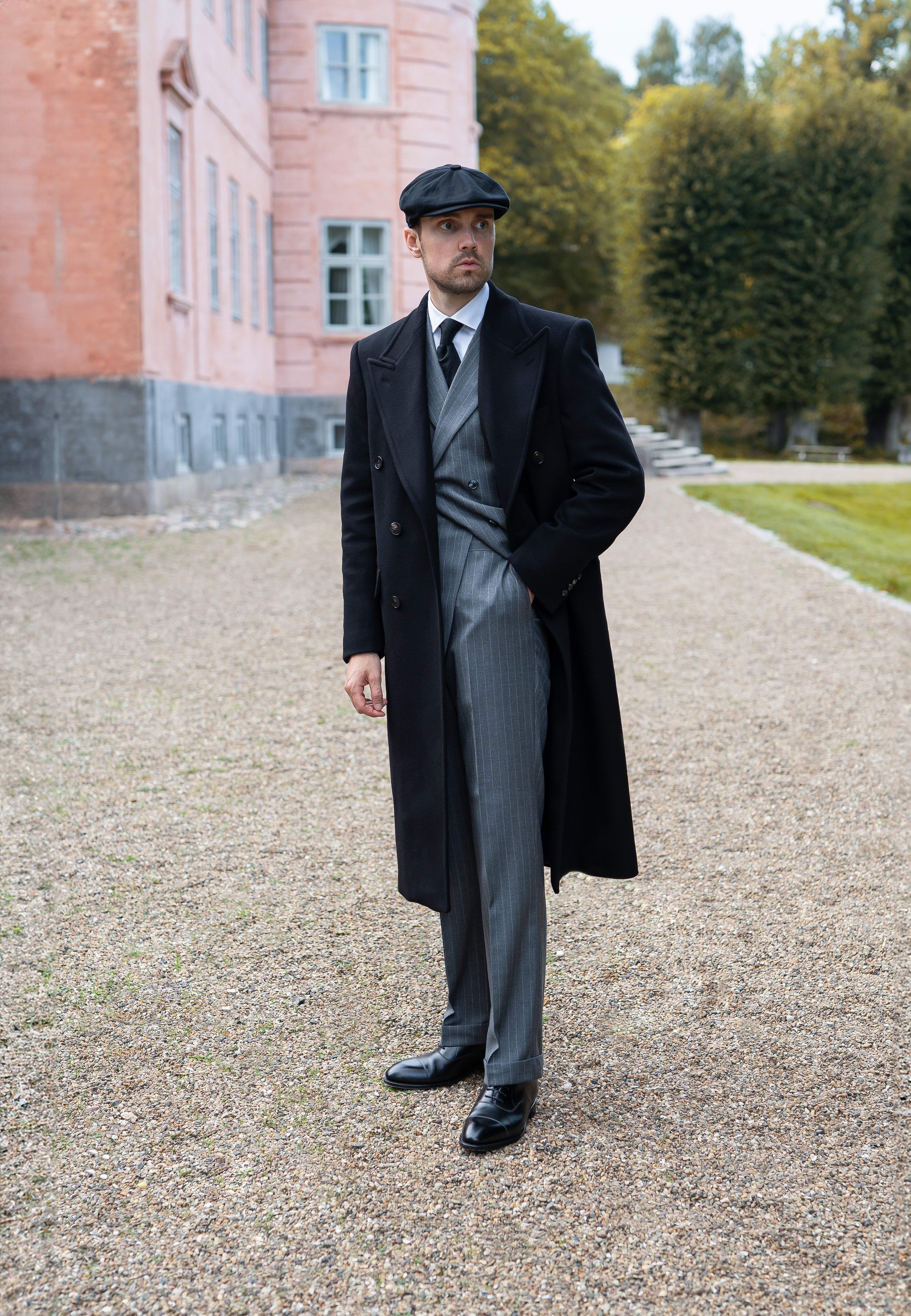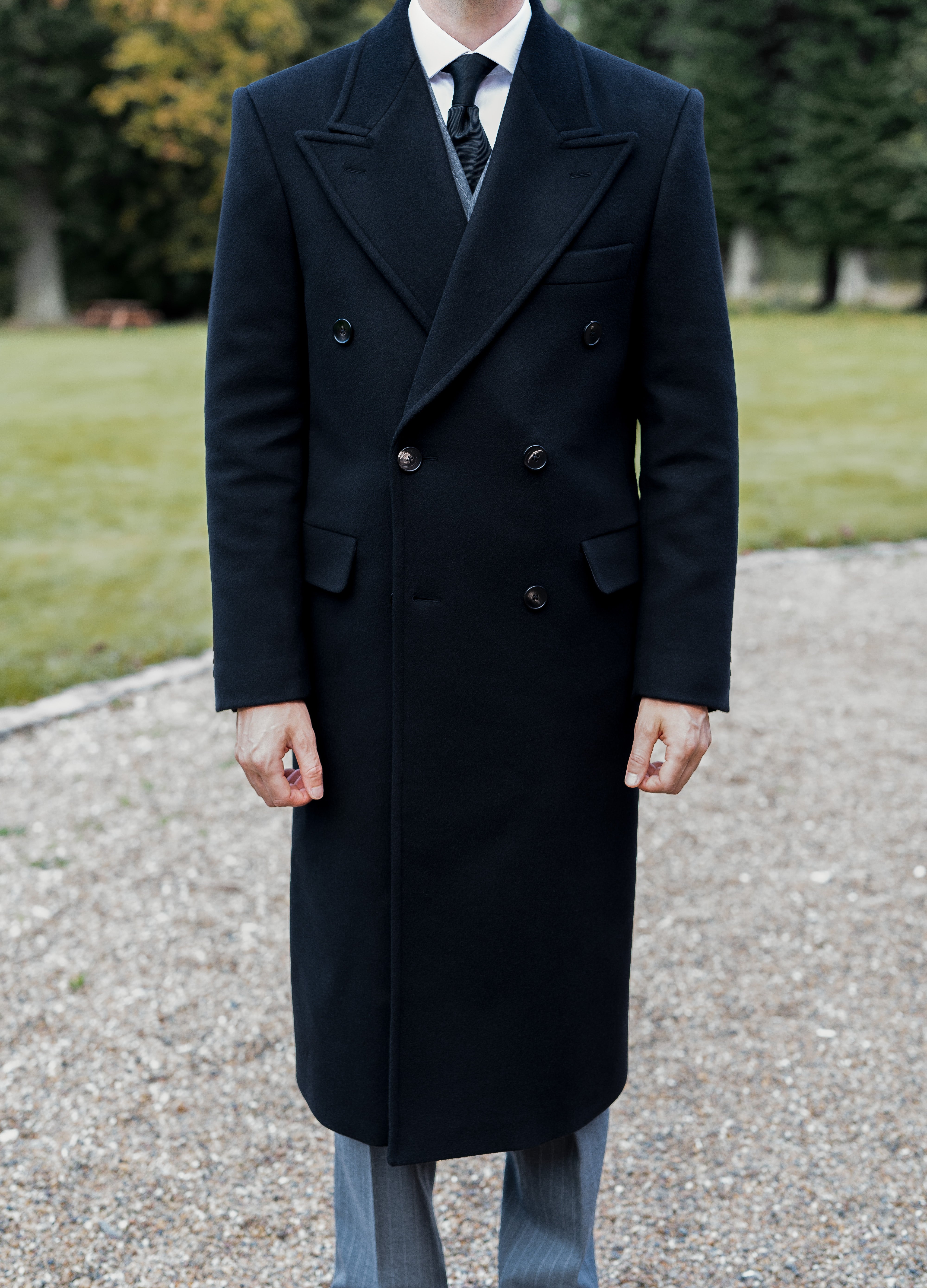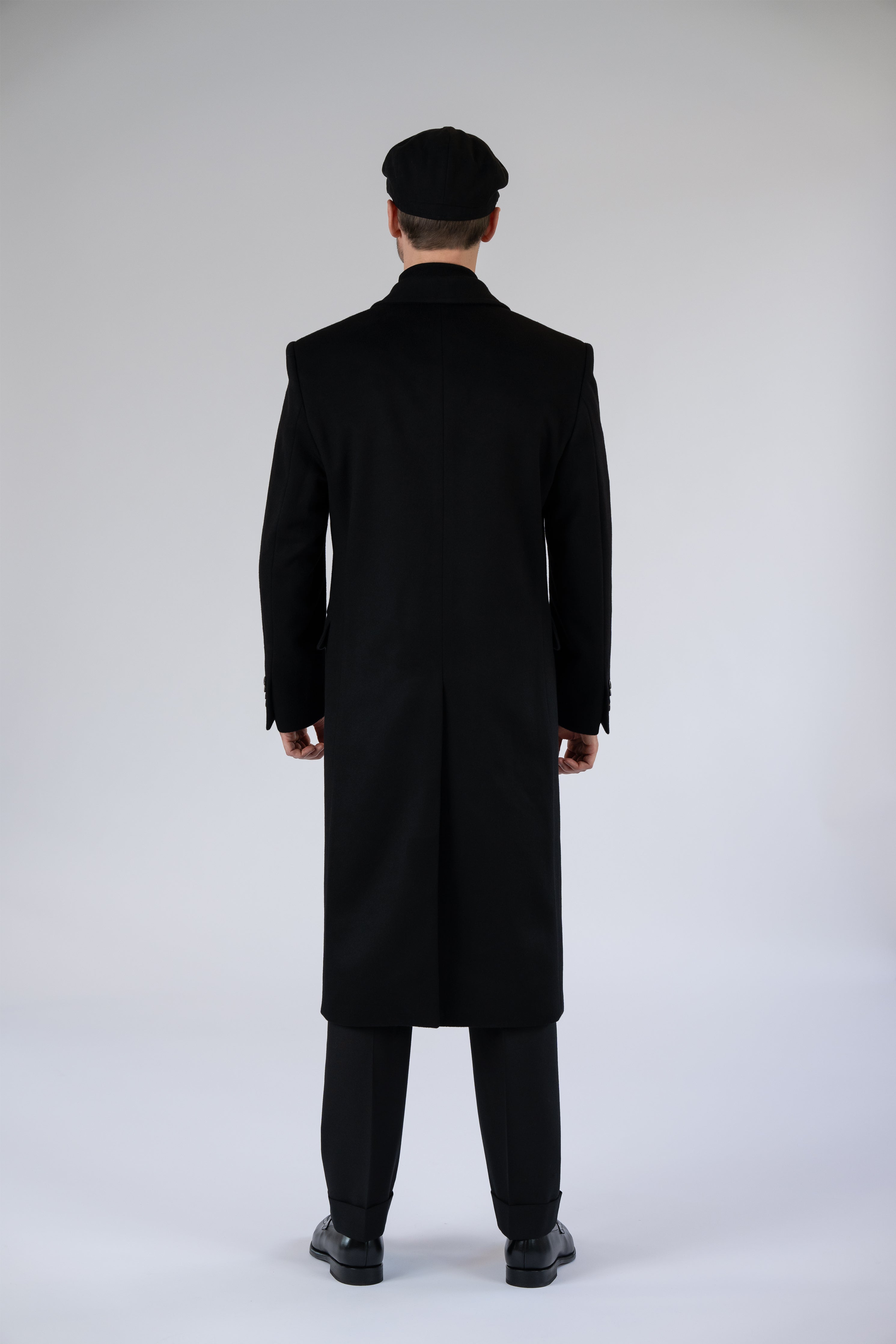 An Italian handmade, double-breasted black coat. This piece is made from a luxurious cashmere-wool blend and is tailored to a regular fit.