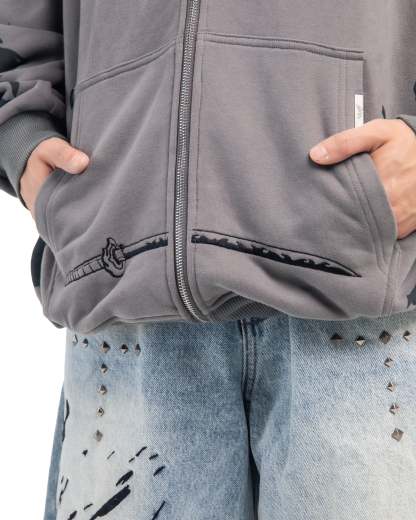 The Flame Pillar Hoodie in vintage grey is crafted from luxury heavyweight cotton, with an oversized fit and drop shoulders. It features a large print design on the back, front and sleeves, as well as an embroidery on the front and back. The hoodie has ribbed hems and cuffs.