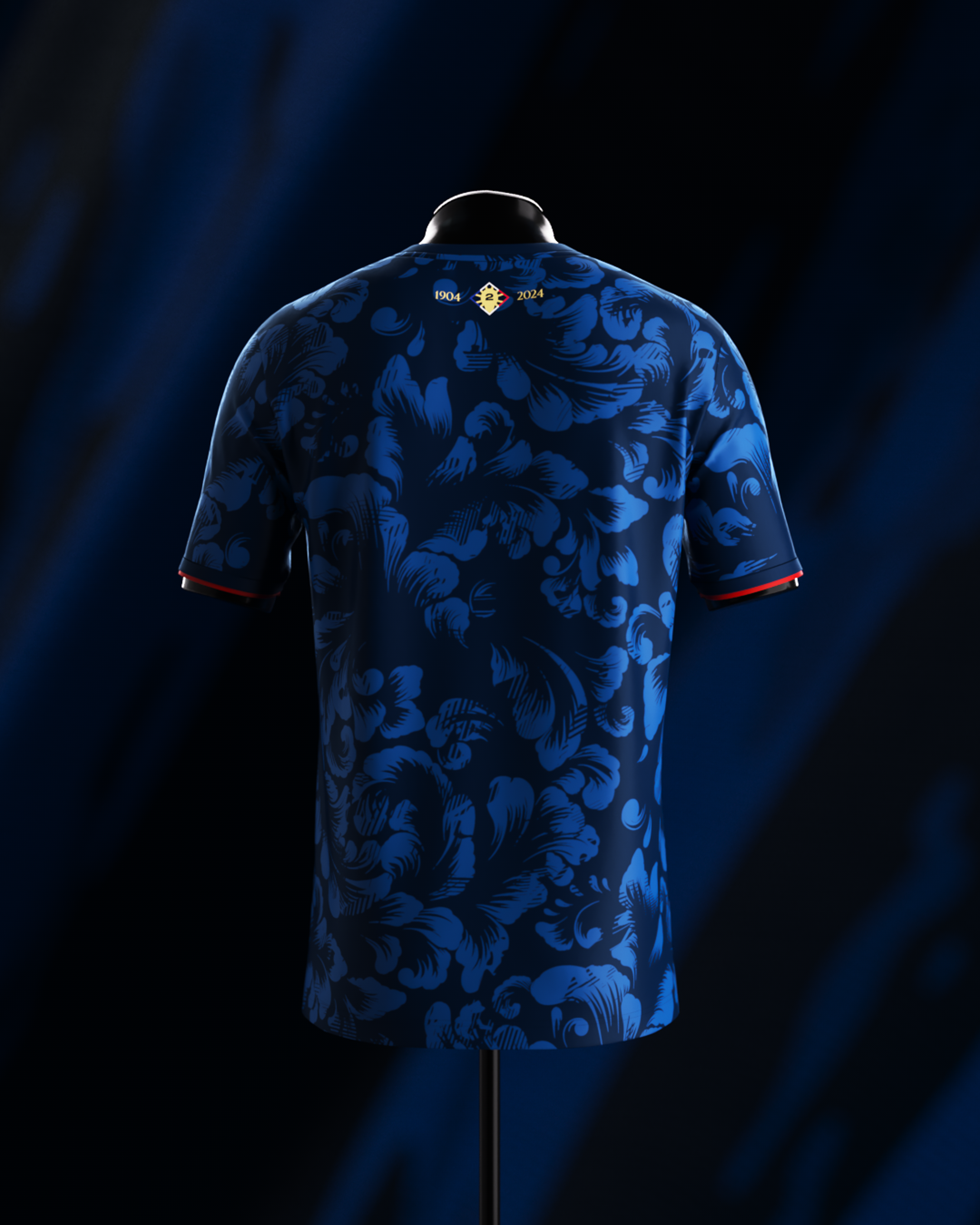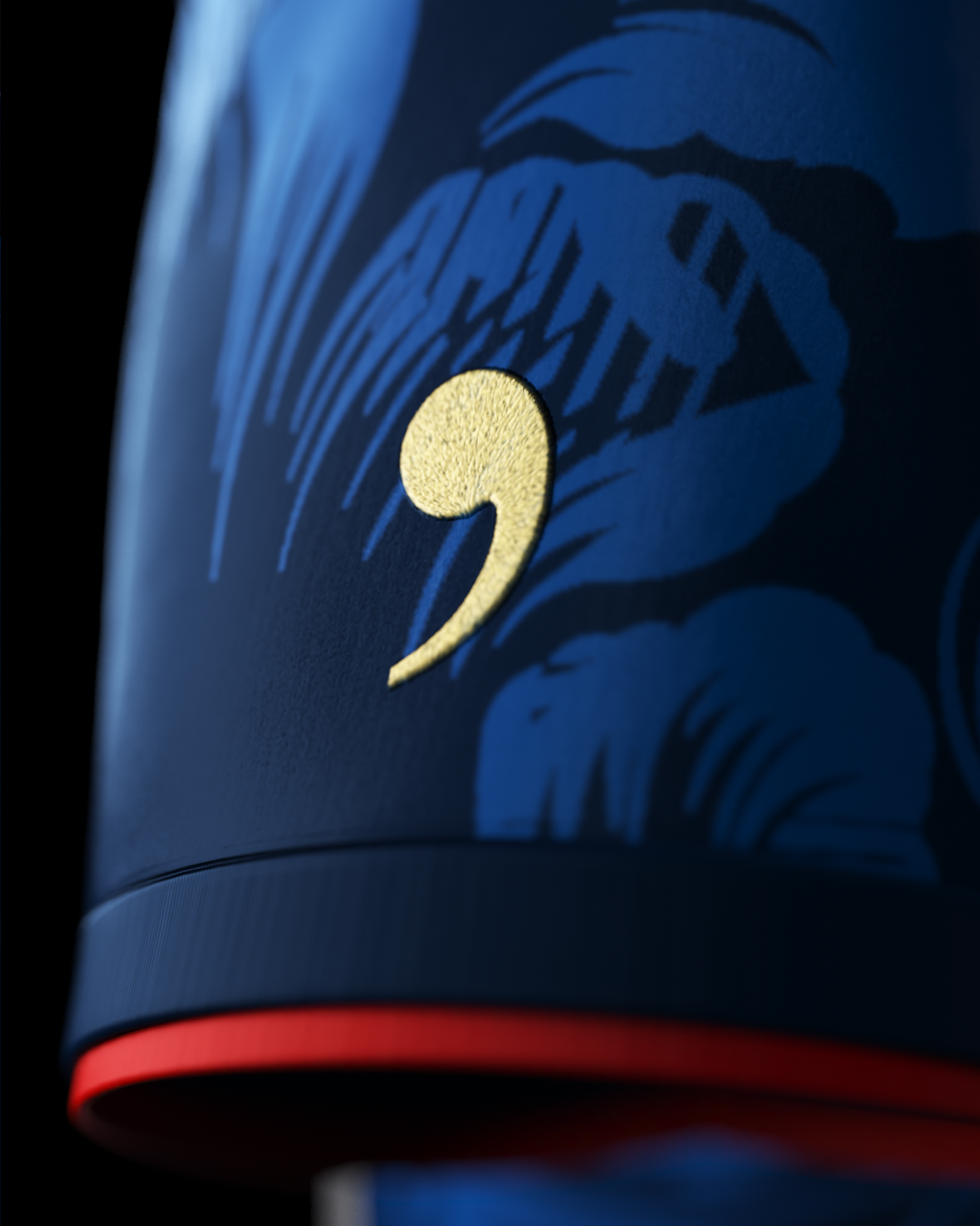 A deep navy jersey featuring a floral pattern inspired by French royalty, and a gorgeous minimalist gold rooster. For the team poised to win it all.