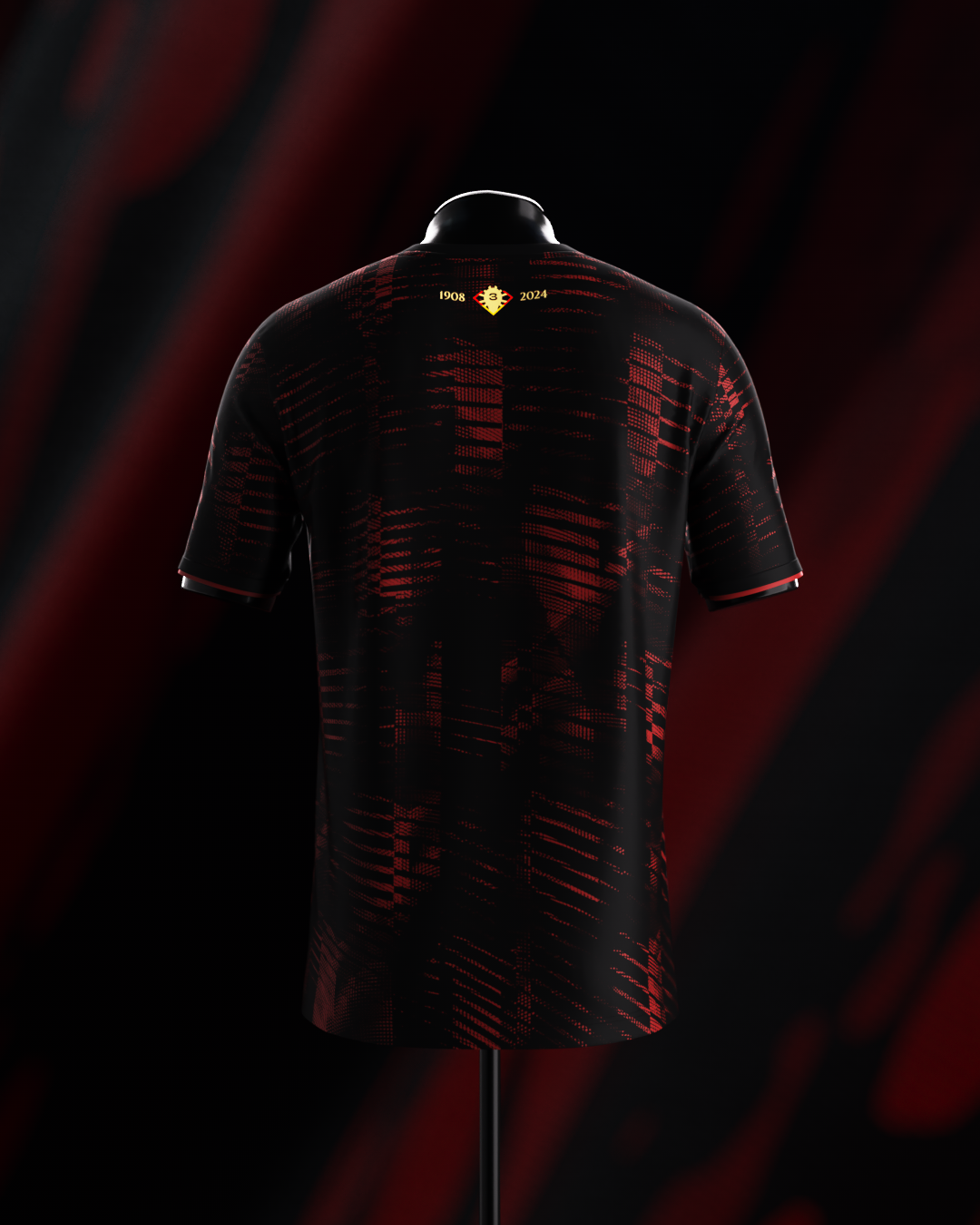 A classic black and red jersey featuring a hypnotic pattern inspired by German excellence, and a shining gold eagle. For the team with home advantage.