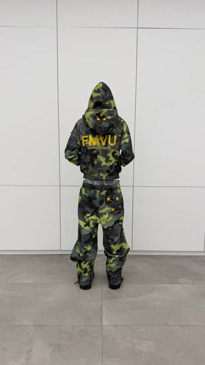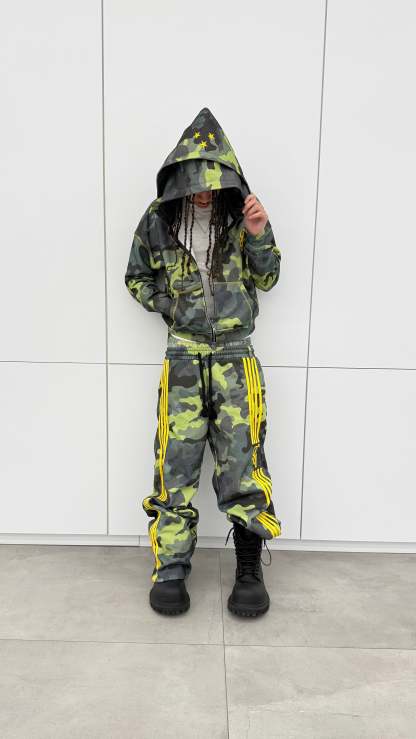Verdant Sweats carry the field into the city. Customized green camo contrasted with bold yellow striping — balance between growth and aggression.