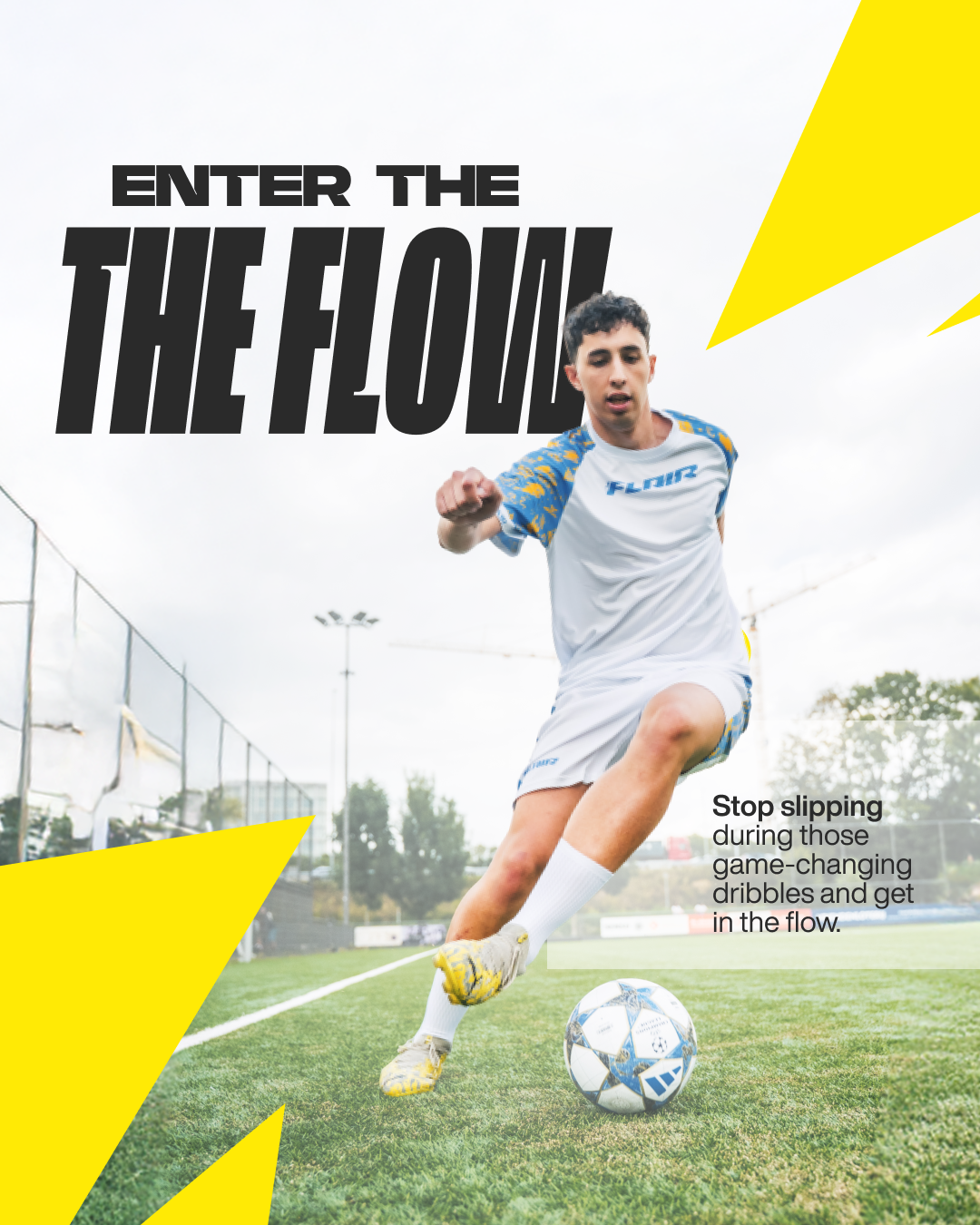 Unlock your full potential with FLAIR Pro Grip Socks. Boost your sprint speed, control, and technique while keeping your feet securely in place within your footwear. Experience enhanced stability that minimizes the risk of ankle, knee, and hip injuries, and say goodbye to blisters for good.