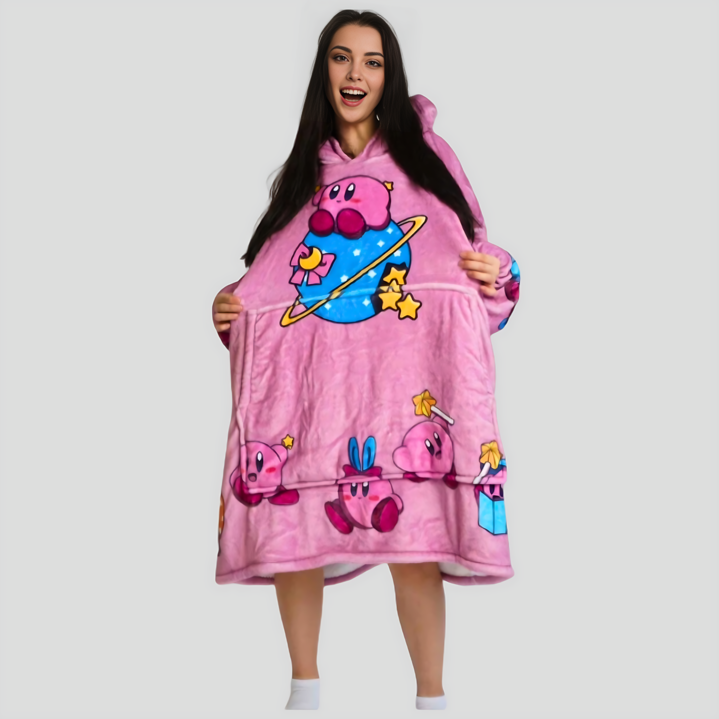 Experience the ultimate wearable anime/Nintendo blanket hoodie — soft, warm, oversized, and perfect for gifting or lounging in Kirby style.