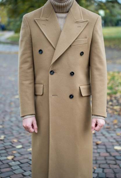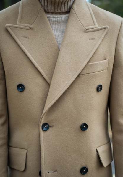 An Italian handmade, double-breasted camel coat. This piece is made from a luxurious cashmere-wool blend and is tailored to a regular fit.