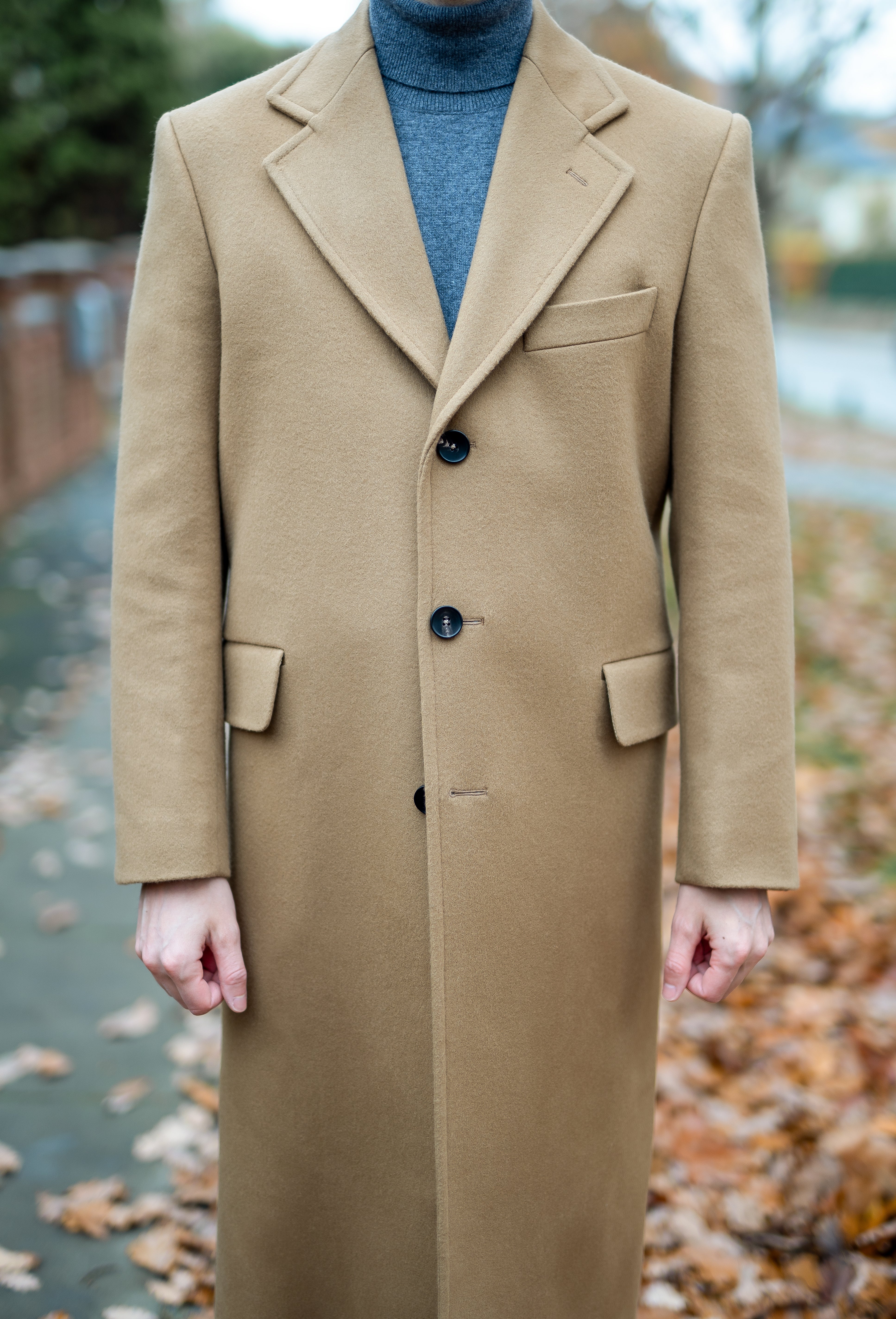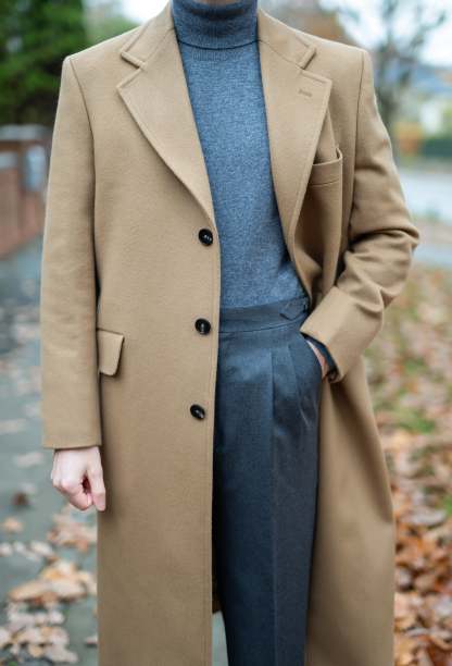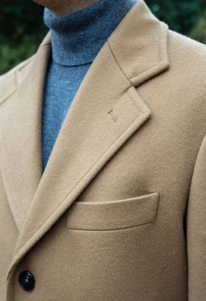 An Italian handmade, single-breasted camel coat. This piece is made from a luxurious cashmere-wool blend and is tailored to a regular fit.