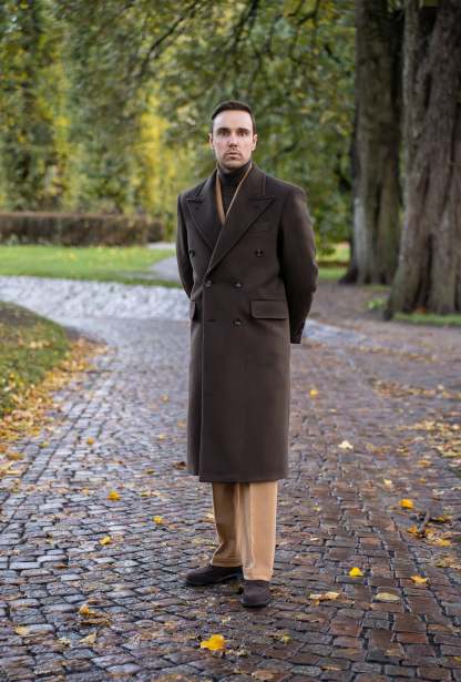 An Italian handmade, double-breasted dark brown coat. This piece is made from a luxurious cashmere-wool blend and is tailored to a regular fit.