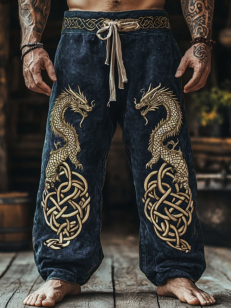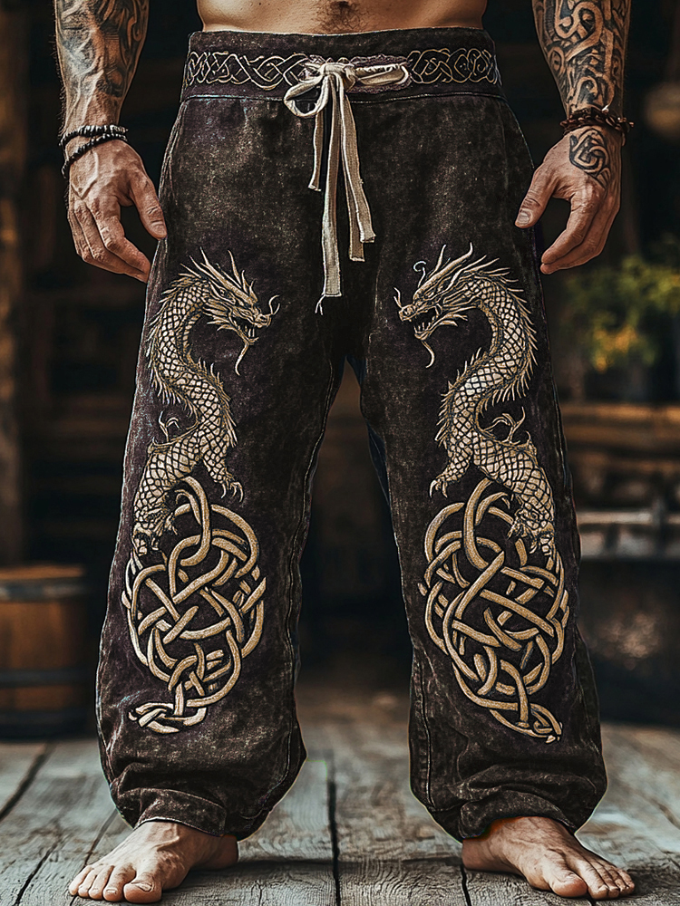 Men's Retro Viking Tribal Dragon Celtic Knot Art Linen Pants