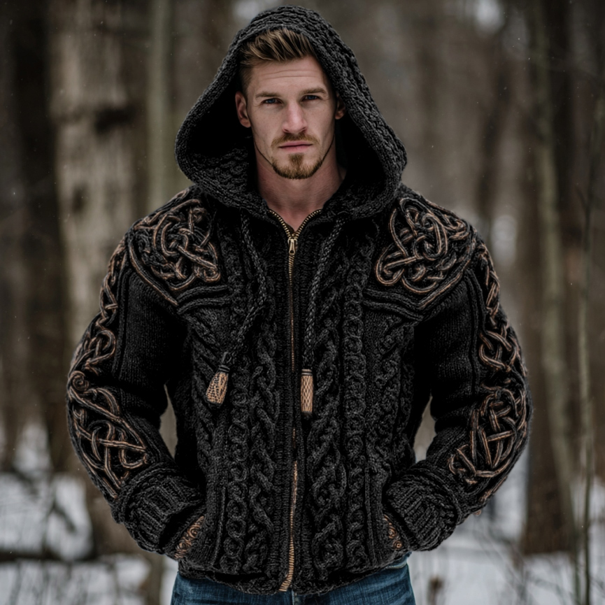 Men's Vintage Viking Celtic Knot Art Chunky Knit Hooded Zip-up Sweater