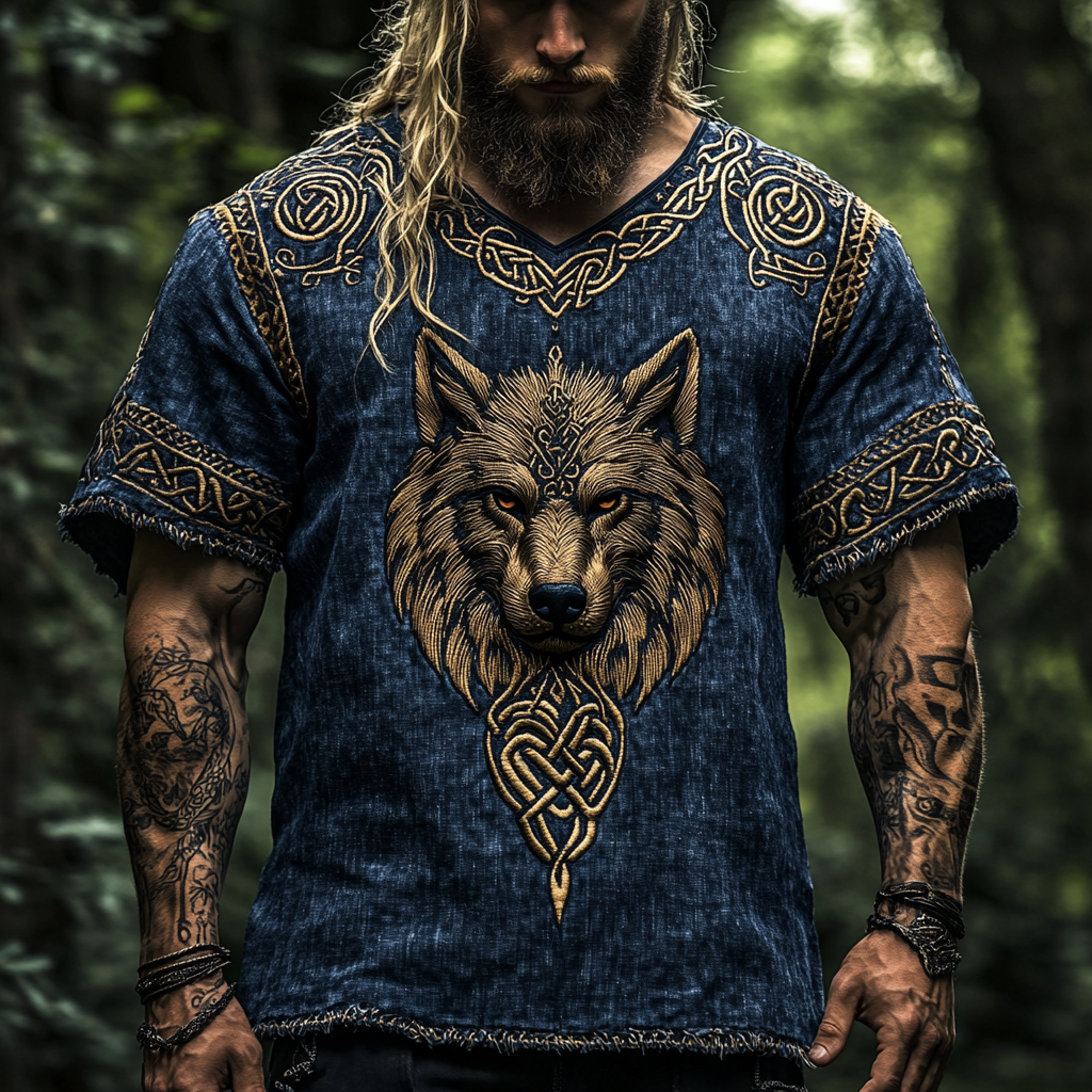 Men's Vintage Viking Wolf Print V-neck Linen Blend T-shirt
