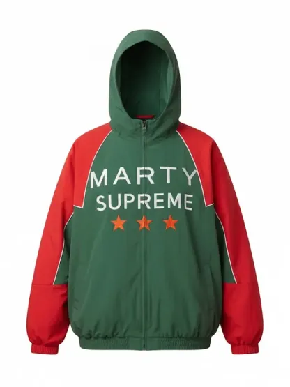 Step into the spotlight with the Marty Supreme Green & Red Mexico Jacket Hoodie. This eye-catching piece features a bold green base with vibrant red shoulders and sleeves, accented by the iconic Marty Supreme branding and three stars. Crafted for comfort and style, it includes a practical hood and elasticized trims, making it a perfect streetwear essential.
