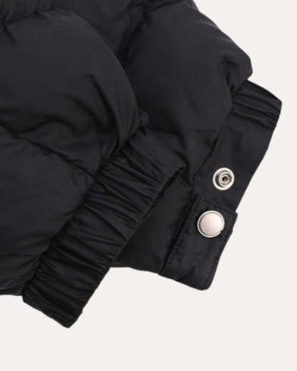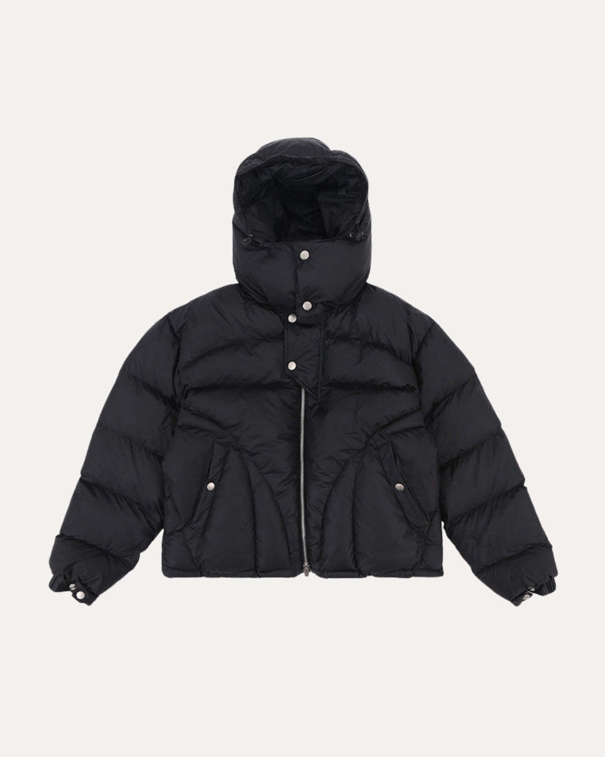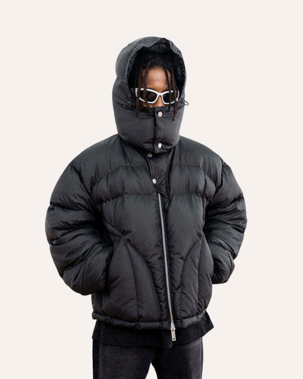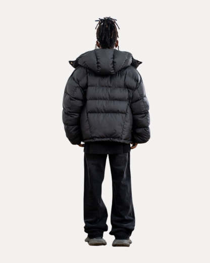 REFINE YOUR STYLE. The Midnight Shield Puffer brings bold winter protection with a sleek, black padded design. Built with a warm insulated fill and a high-coverage hood, it delivers comfort and structure for cold-weather outfits.