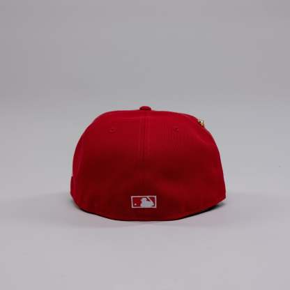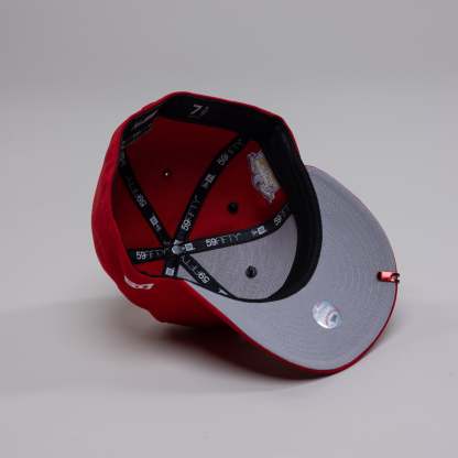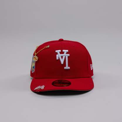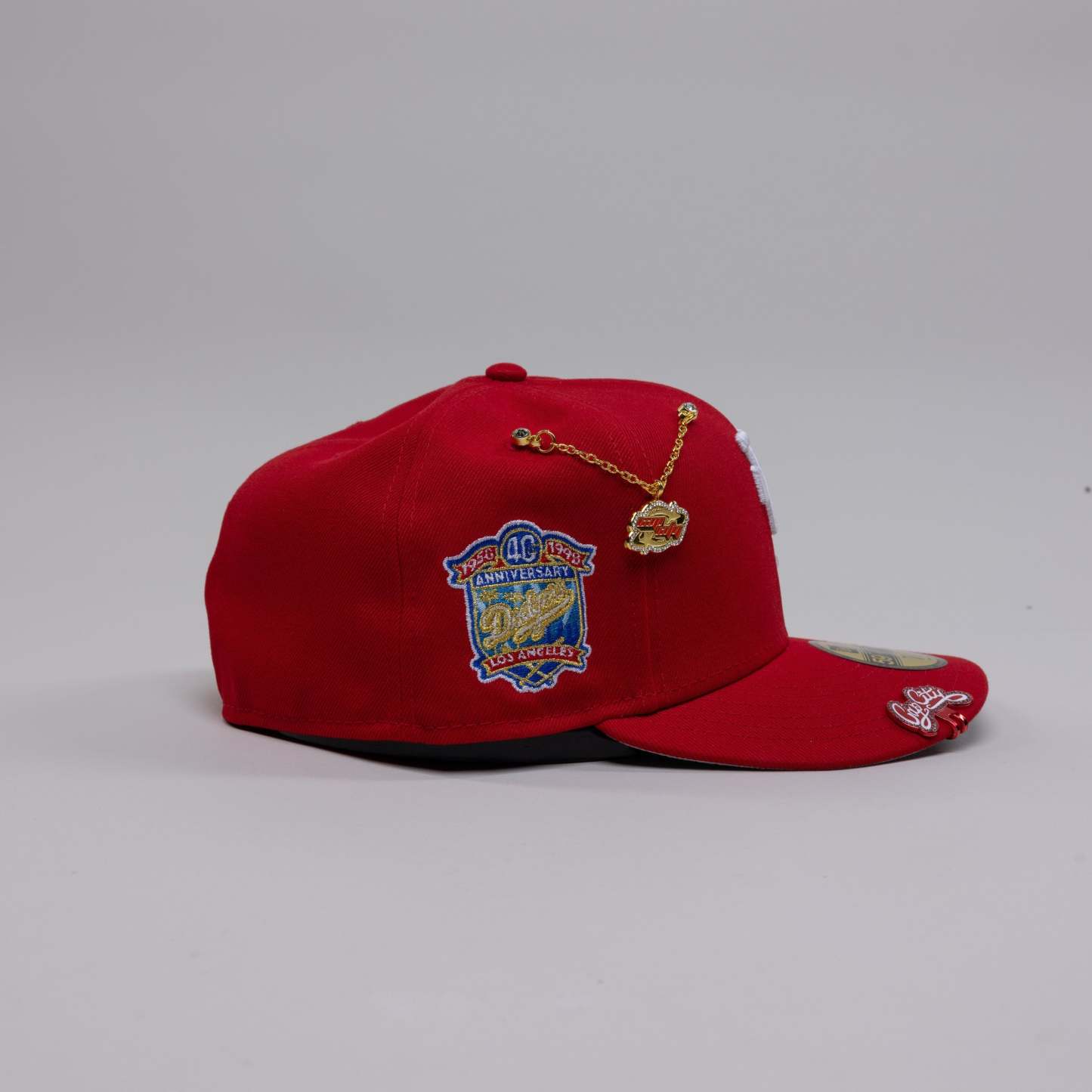 NEW ERA EXCLUSIVE 59FIFTY RED UPSIDE DOWN LOS ANGELES DODGERS W/ 40TH ANNIVERSARY SIDE PATCH