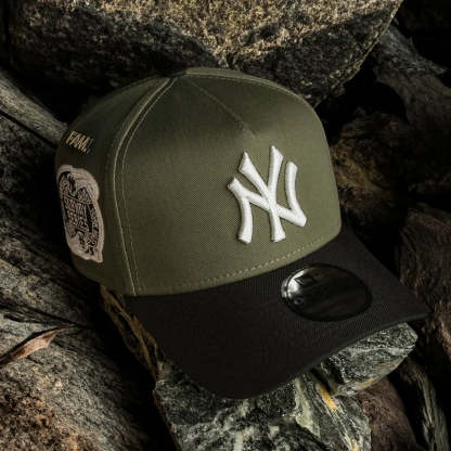 The New York Yankees MLB 9FORTY A-Frame Cap by New Era blends vintage baseball energy with a rugged, modern colorway. Featuring an olive green crown and black visor paired with a gray undervisor, this cap brings understated style with historic pride. On the front, you’ll find the iconic New York Yankees logo embroidered in matching tones, while the side displays the legendary 2000 World Series Subway Series sidepatch, celebrating one of the most iconic matchups in baseball history.
