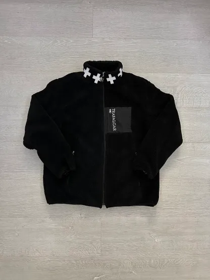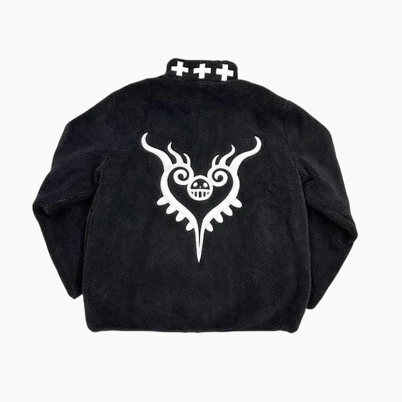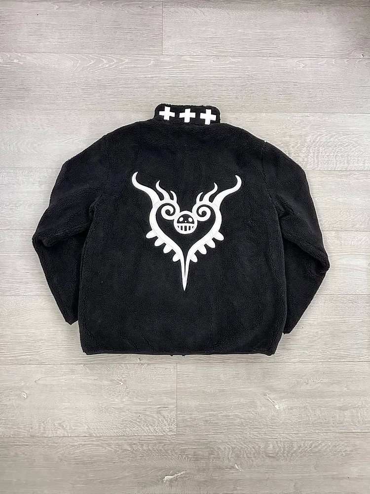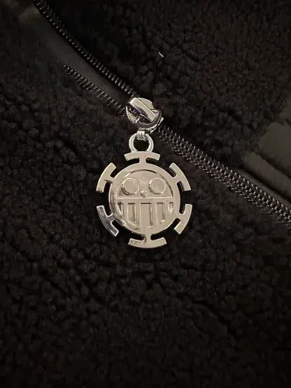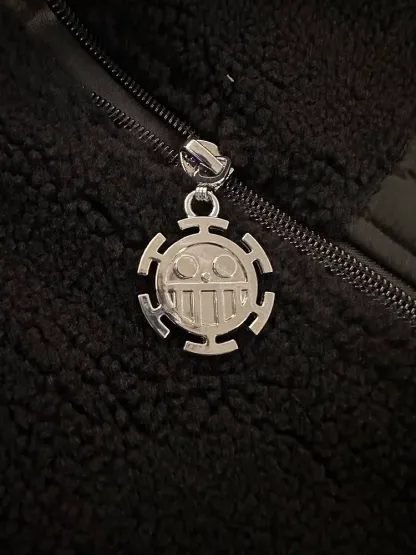 This is a reversible sherpa jacket with patterns and motifs from Eichiro Oda's One Piece.