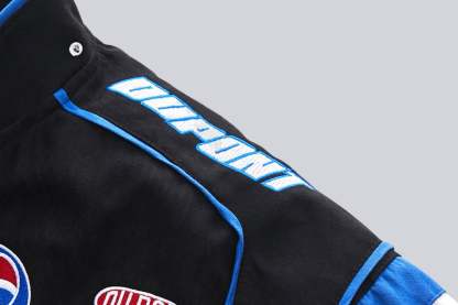 - Design: Features intricate embroidery, sewn patches, and bold racing-inspired details