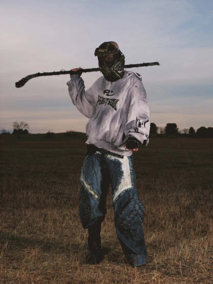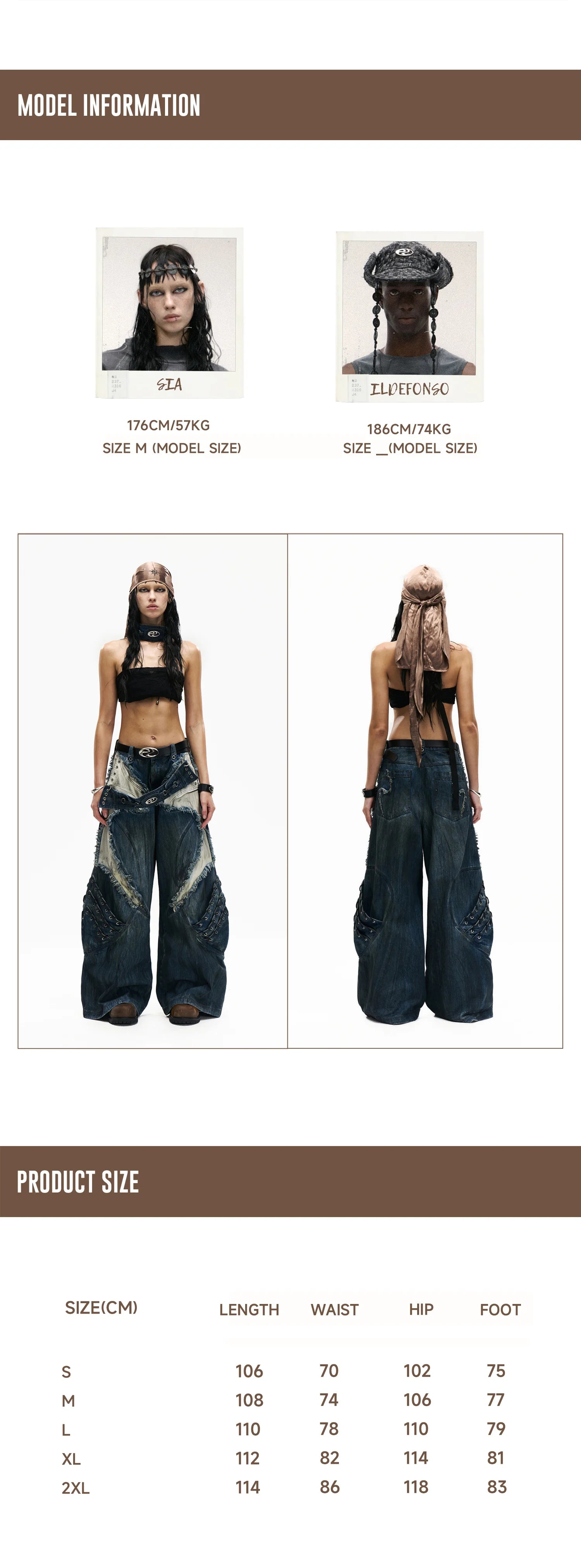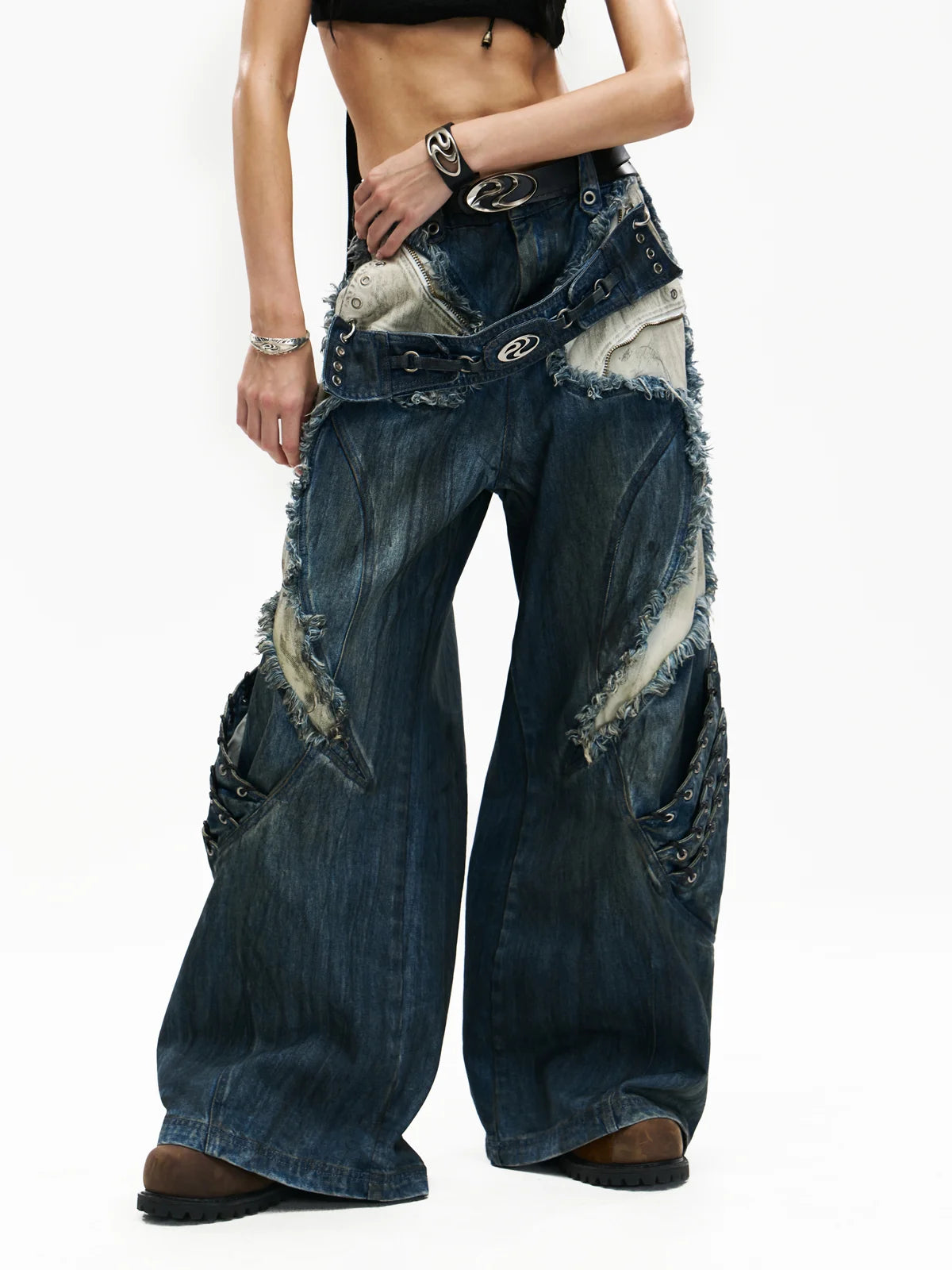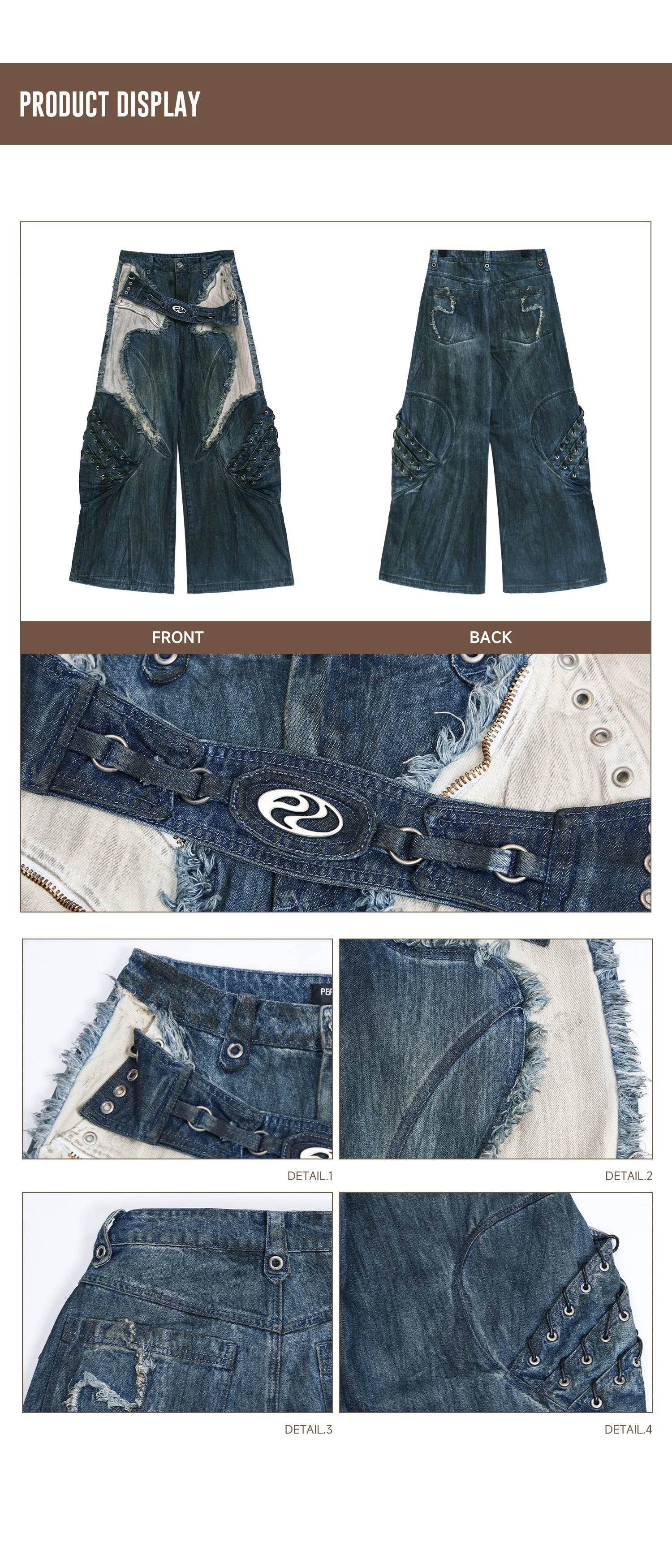 • A-Line Loose Fit.• Unisex.• 100% Cotton.• Blue And White Denim Color-Blocking.• Armor Elements Are Designed At The Knees.• Tone-On-Tone Belt At Waist.