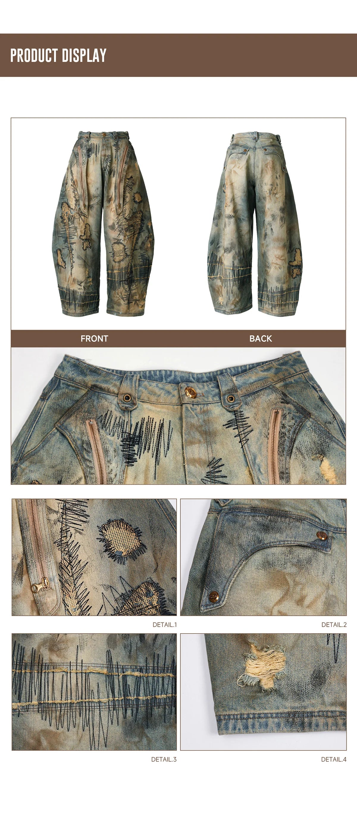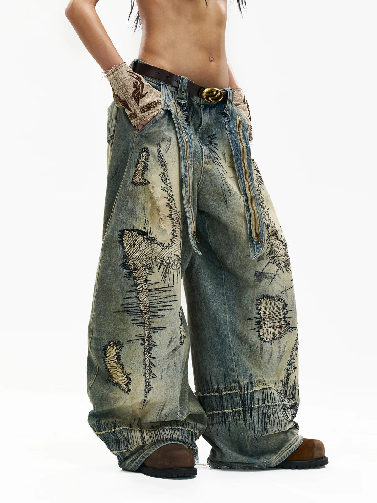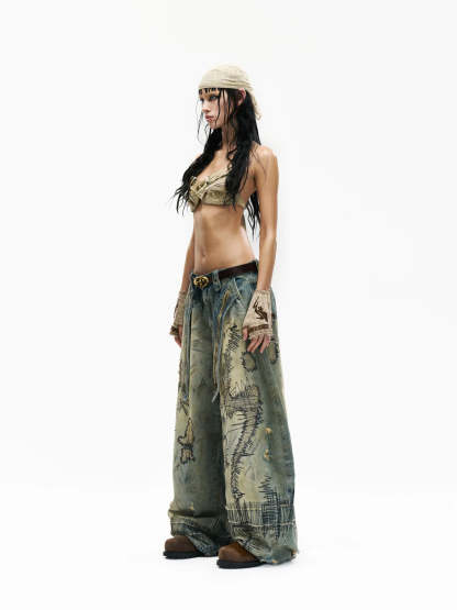 Personsoul Stain Embroidery Curved Jeans