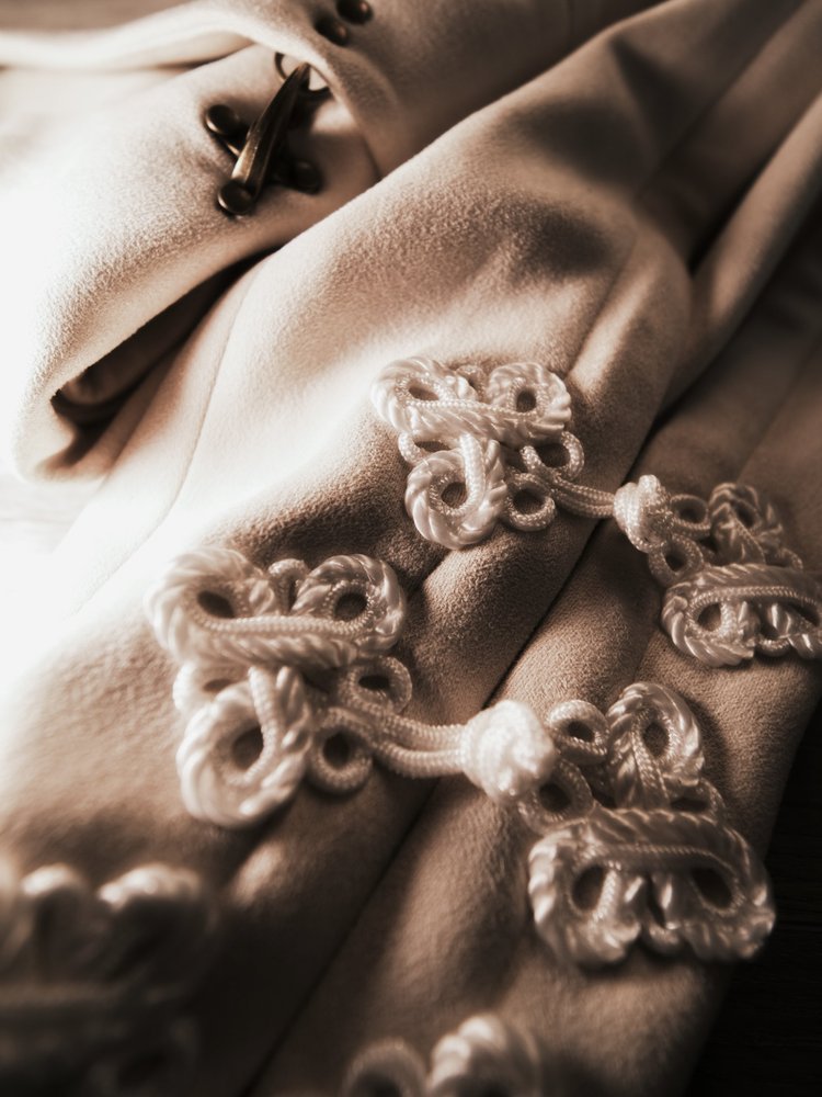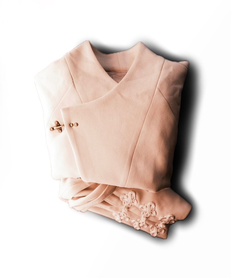 Jacket features hanfu inspired silhouette with detachable and retractable beige panel system. Asymmetric front closure with copper finished metal buckles and faux suede fabric to complete the piece. Conceived for all-season versatility, each element has been meticulously chosen to embody quiet luxury and endure form. A testament of our craftsmanship, and the art of elevated essentials.