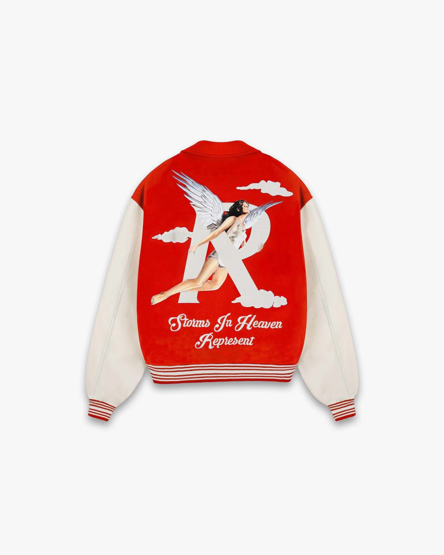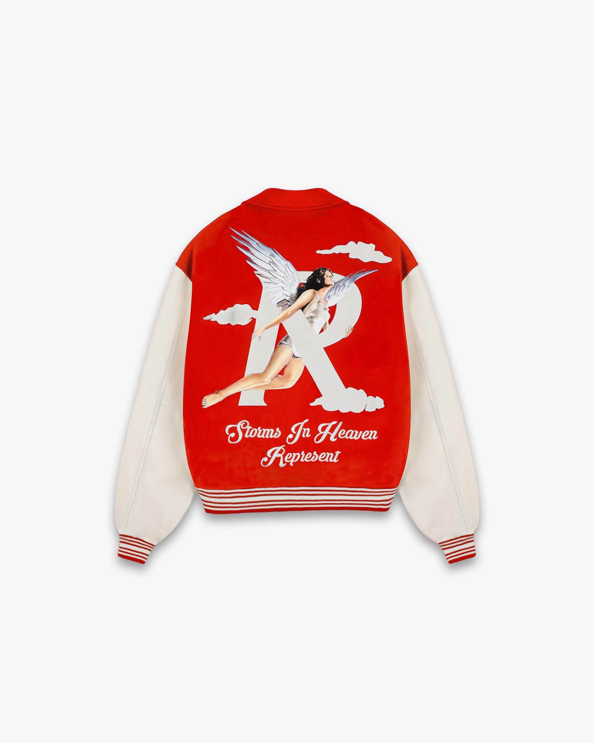 The Storms in Heaven Varsity Jacket in Burnt Red takes the elements of the classic letterman jacket and updates them with contemporary characteristics. The jacket features our Storms in Heaven graphic logo and embroidered motif to the front and back. It has press stud fastenings to the front as well as a large foldover collar.