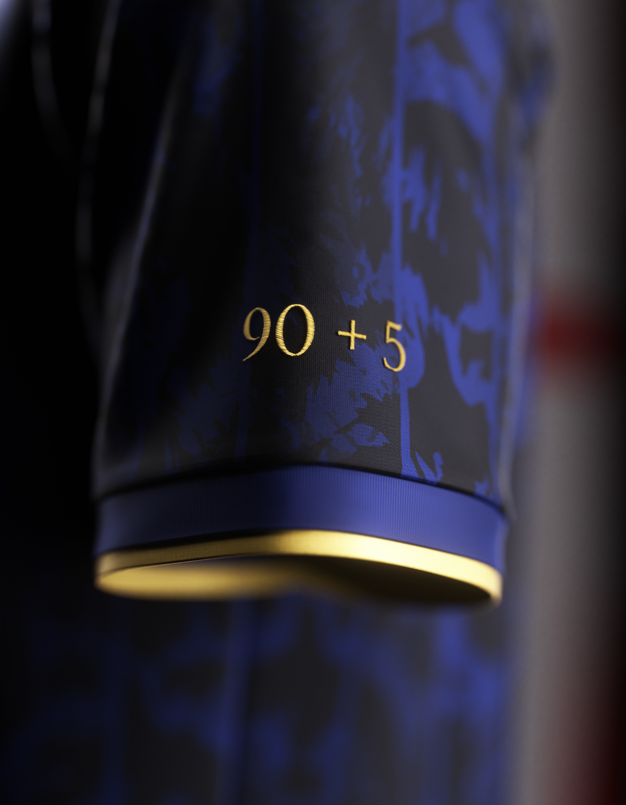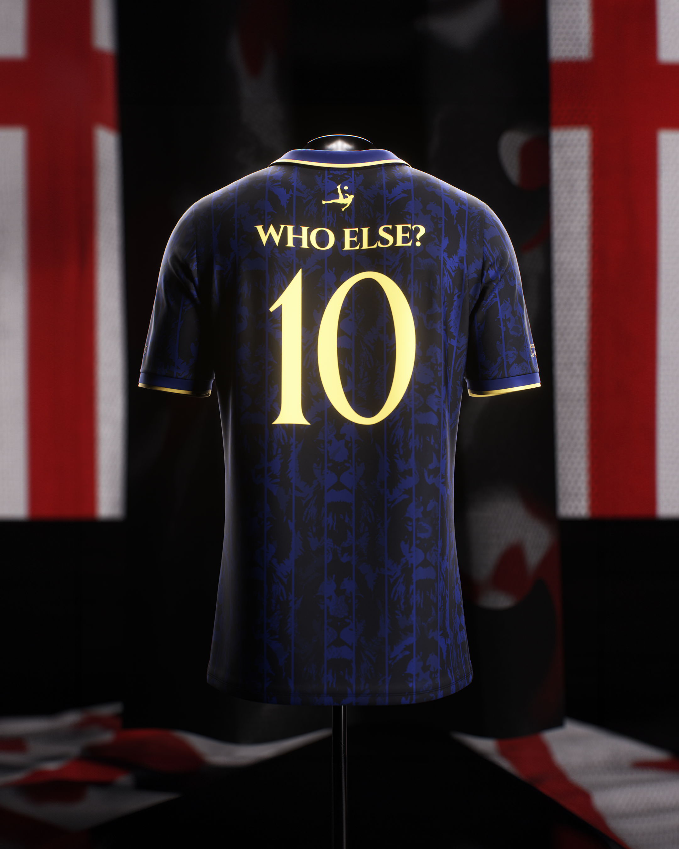 A deep blue, retro jersey featuring a lion-inspired pattern, gold detailing throughout, and a silhouette of the goal that changed everything.