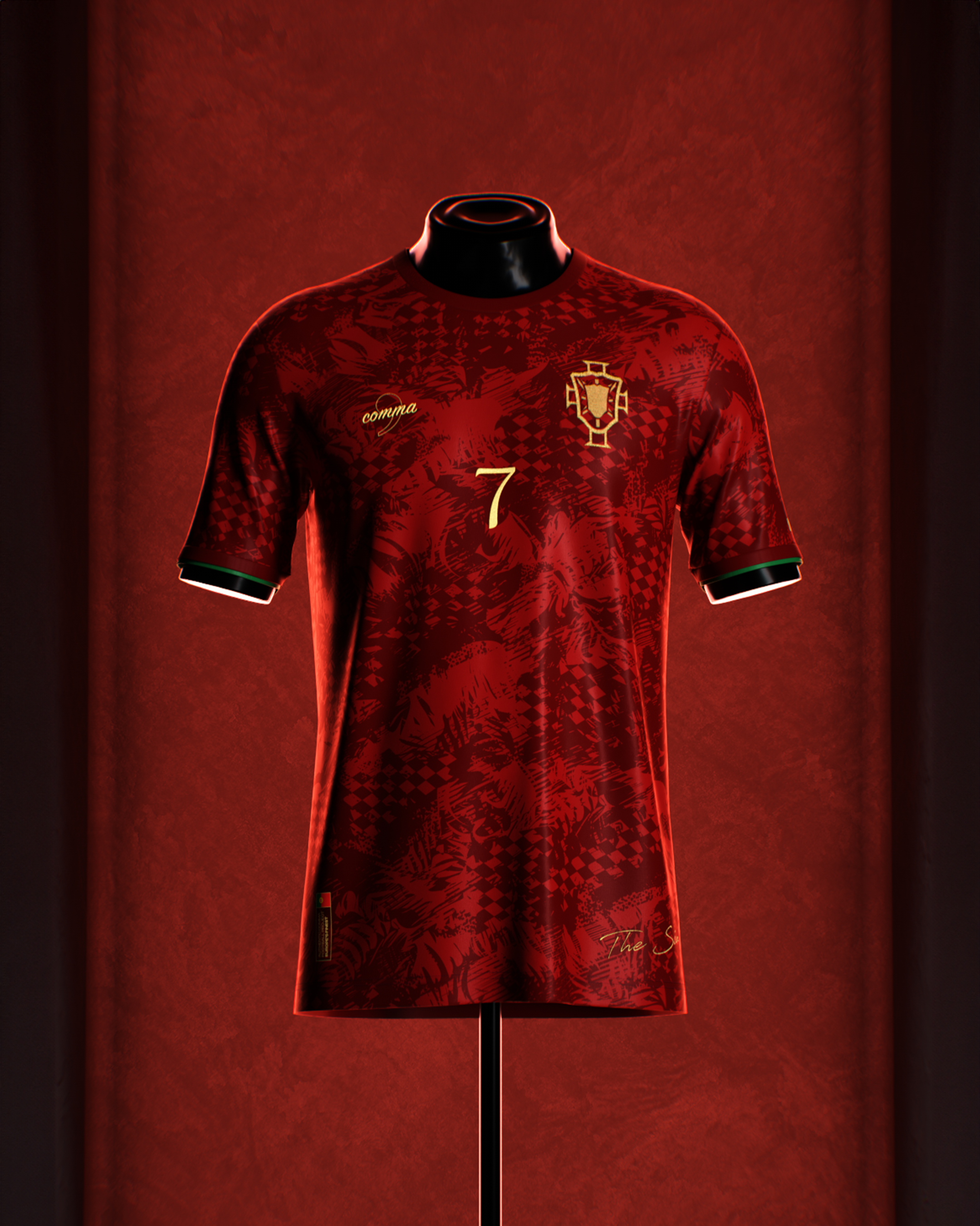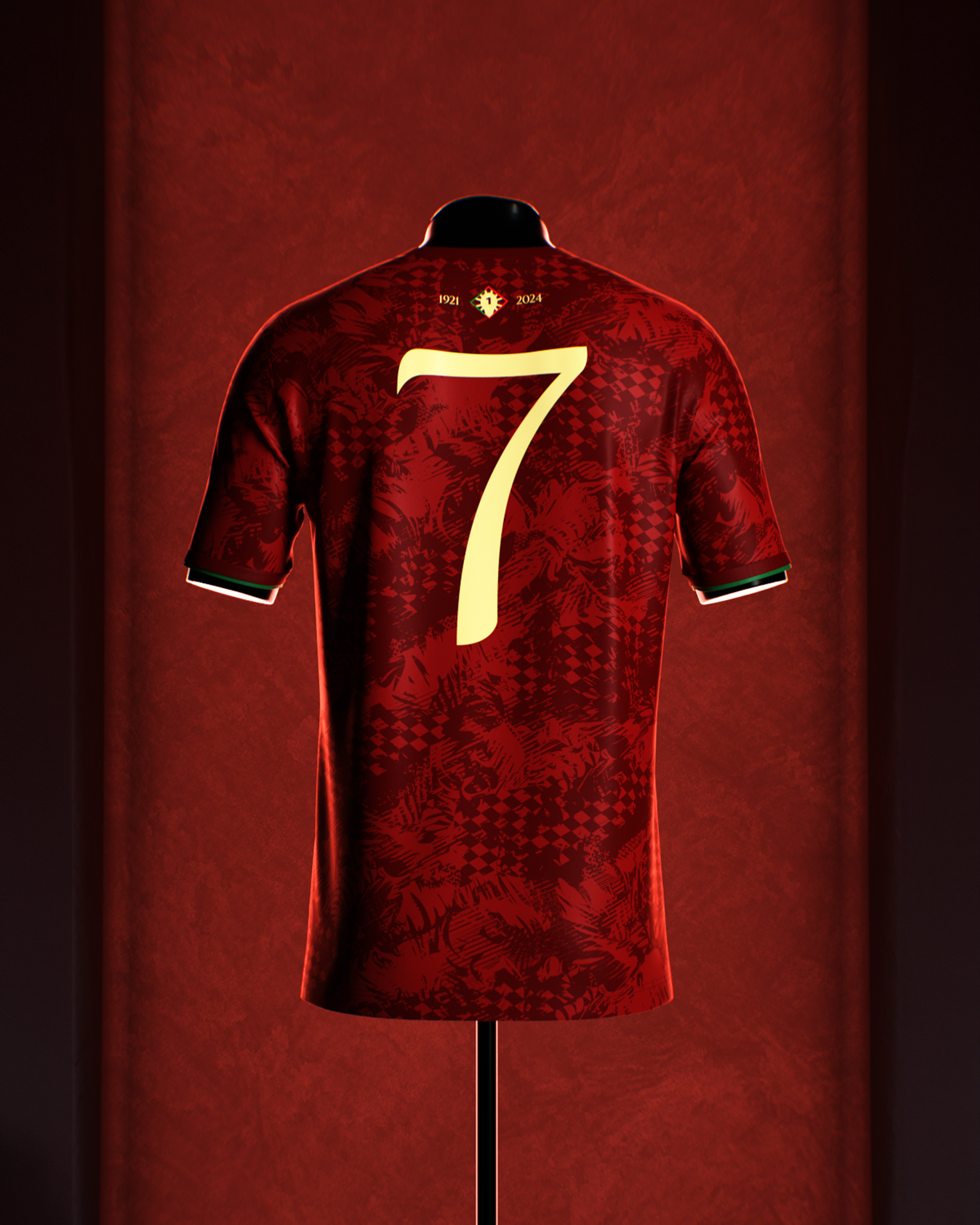 A deep red jersey featuring a dynamic pattern inspired by the Portuguese spirit, embroidered gold detailing, and our signature two-layered sleeve cuffs. All topped off with The Siu's signature Number 7.