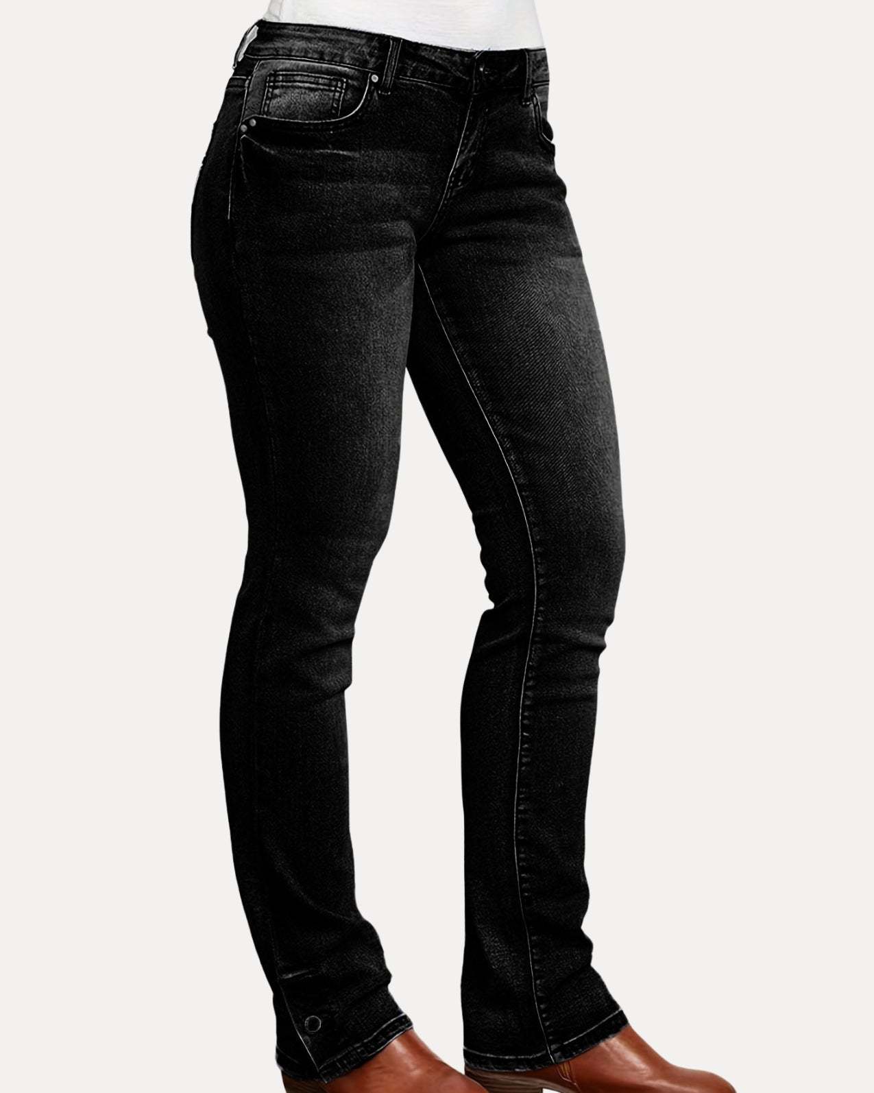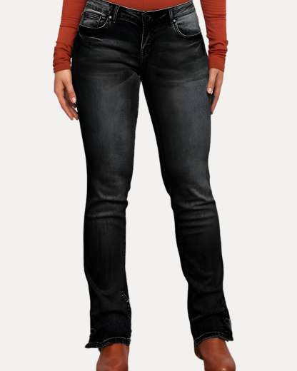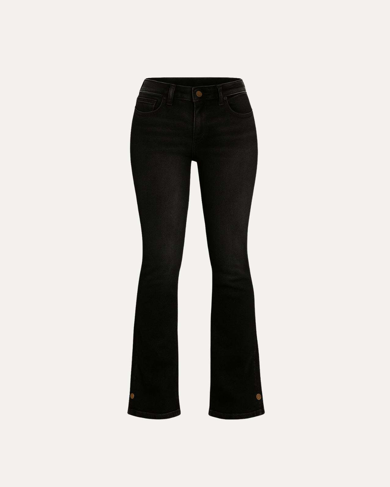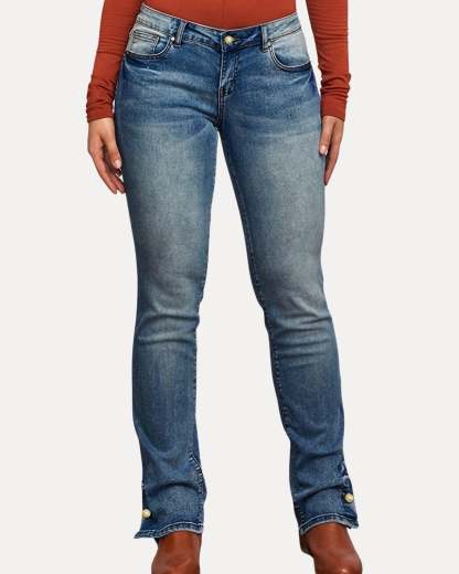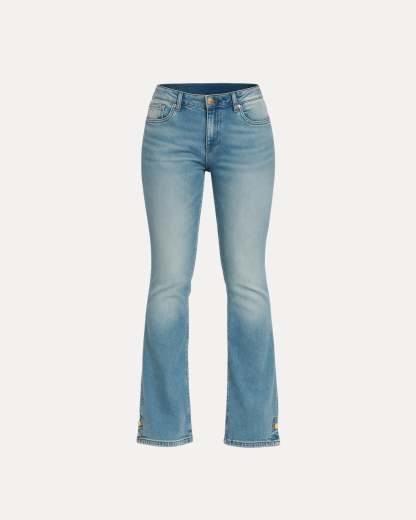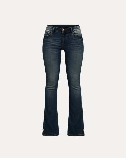 REFINE YOUR STYLE. The True Flared Jeans feature a mid-blue wash with a subtle fade and button details near the hem for a modern touch. Designed for everyday comfort, these jeans move with you while keeping their clean shape through every wear.
