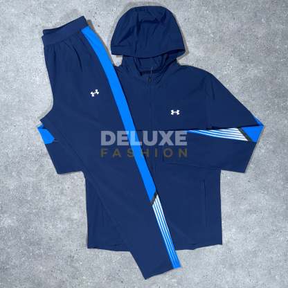 This men's Velocity Storm Jacket from Under Armour keeps out the weather. Fabric is light and water-resistant, while the full-zip fastening and hood keep you covered. Zip-up pockets hold your essentials. Landing in navy, it's signed off with blue striped detailing and signature branding.