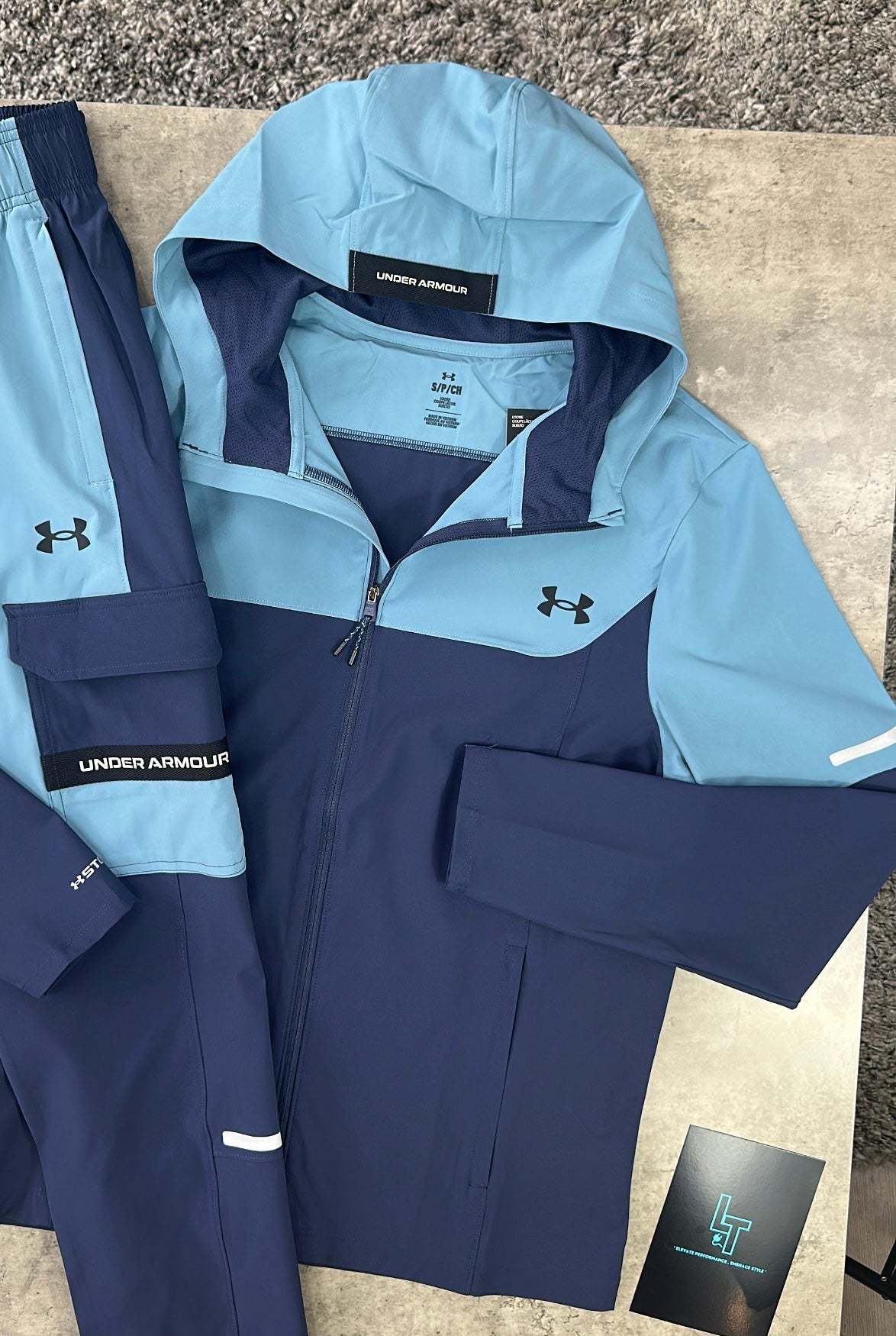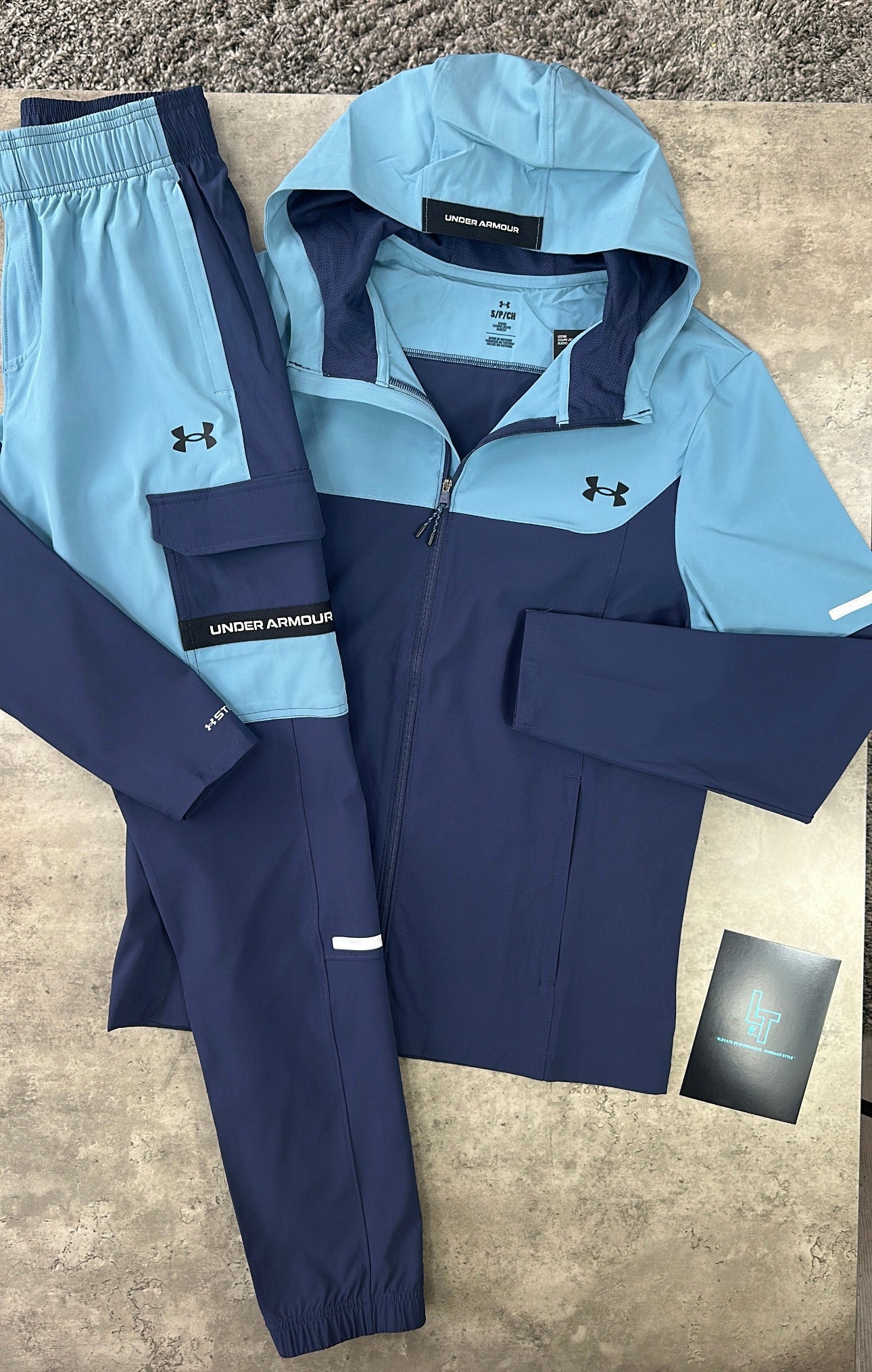 The UNDER ARMOUR TECH UTILITY TRACKSUIT in blue is engineered for superior performance and comfort. Featuring UA Storm technology, it repels water while maintaining breathability. Its lightweight stretch-woven fabric offers durability and unrestricted movement through 4-way stretch material. Practical design elements include an encased elastic waistband with internal drawcord, secure zip hand pockets, a back pocket, flap-closure cargo pockets, and encased elastic cuffs for a secure fit. This track suit is ideal for active wearers seeking protection and versatility in all conditions.