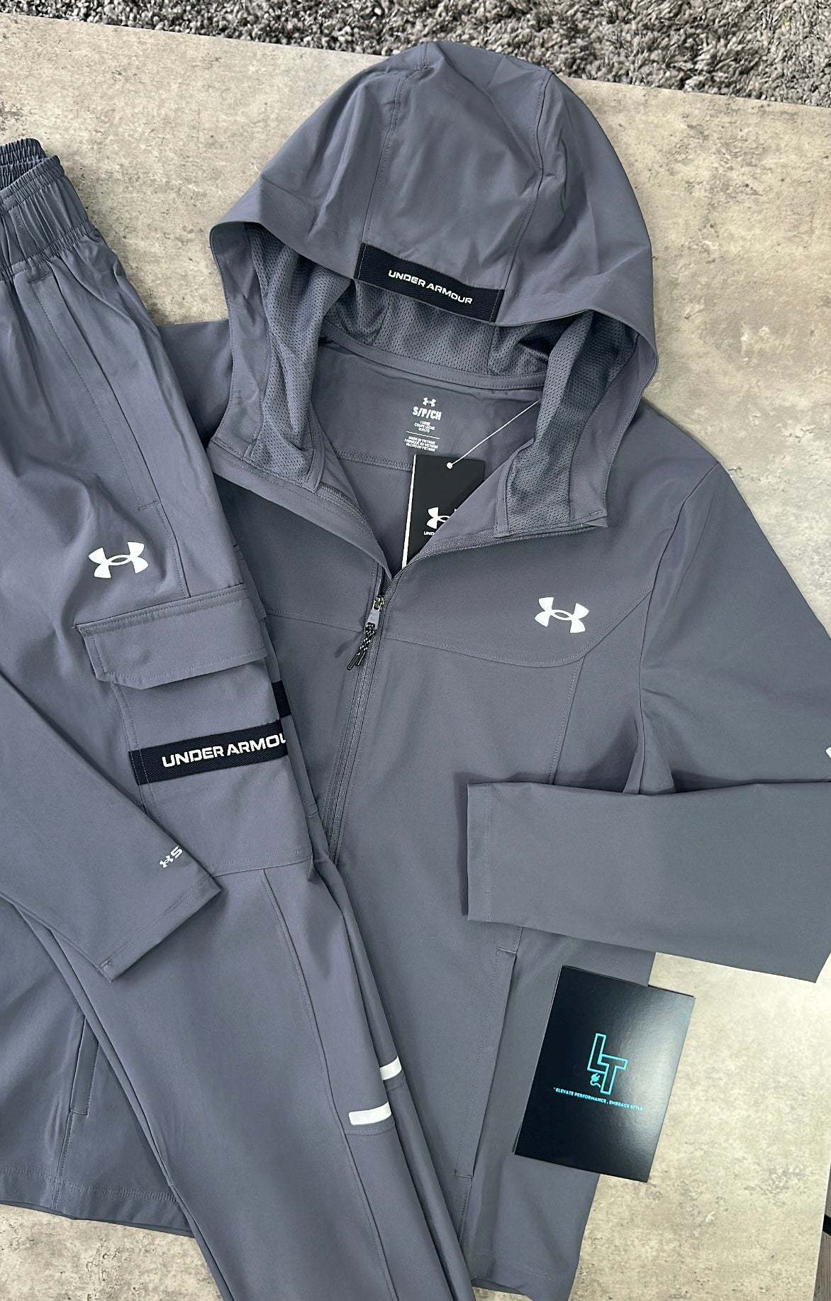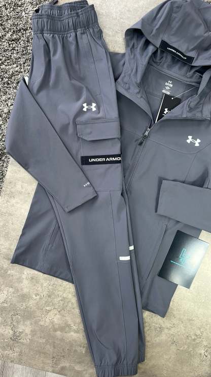 The UNDER ARMOUR TECH UTILITY TRACKSUIT in grey delivers exceptional comfort and performance. Equipped with UA Storm technology, it effectively repels water without compromising breathability. Crafted from lightweight stretch-woven fabric with 4-way stretch, it ensures durability and freedom of movement. Key features include an encased elastic waistband with an internal drawcord, secure zip hand pockets, back pocket, flap-closure cargo pockets, and encased elastic cuffs for a snug fit. This tracksuit is perfect for those needing reliable protection and functionality across varied conditions.
