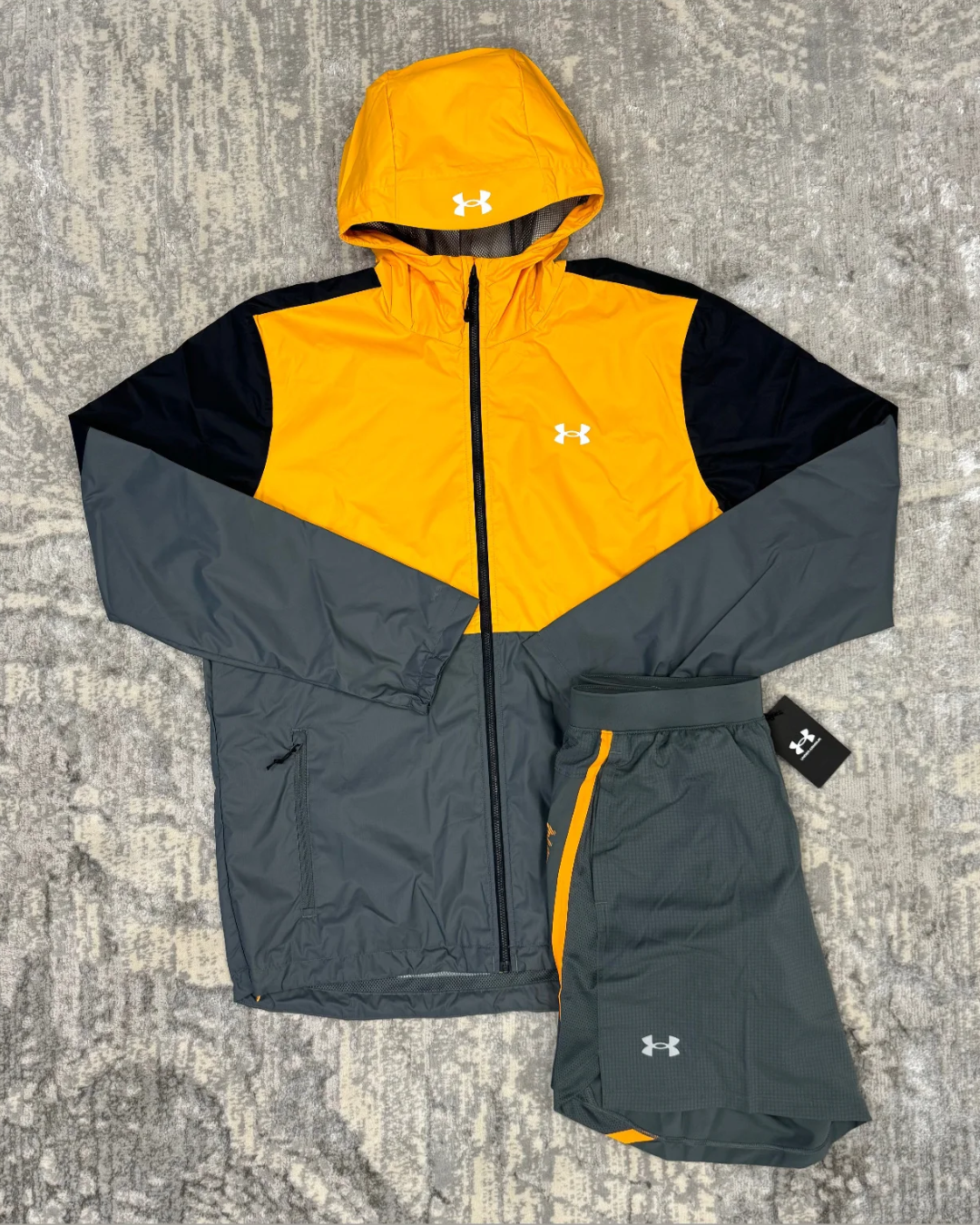 Stay ready for any workout with the Under Armour Windrunner Set in a bold orange and grey colorway. Designed for performance and comfort, this set includes a lightweight windbreaker jacket and matching track pants, making it perfect for training or casual wear.