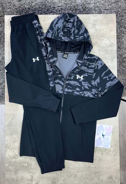 UNDER ARMOUR WOVEN TRACKSUIT - BLACK CAMO, This tactical-inspired tracksuit merges contemporary aesthetics with functional design for versatile everyday wear. The woven camo jacket utilises breathable, lightweight fabric engineered to regulate temperature during varied activity levels. A full zip closure and adjustable hood deliver adaptable coverage, whilst strategically positioned zip pockets offer practical storage solutions. The coordinating track pants feature smooth, lightweight woven construction with an elasticated waistband for secure fit and cuffed ankles that create a refined, tapered profile. Whether layering for training or transitioning between environments, this tracksuit balances contemporary camo styling with the technical performance characteristics serious athletes expect.