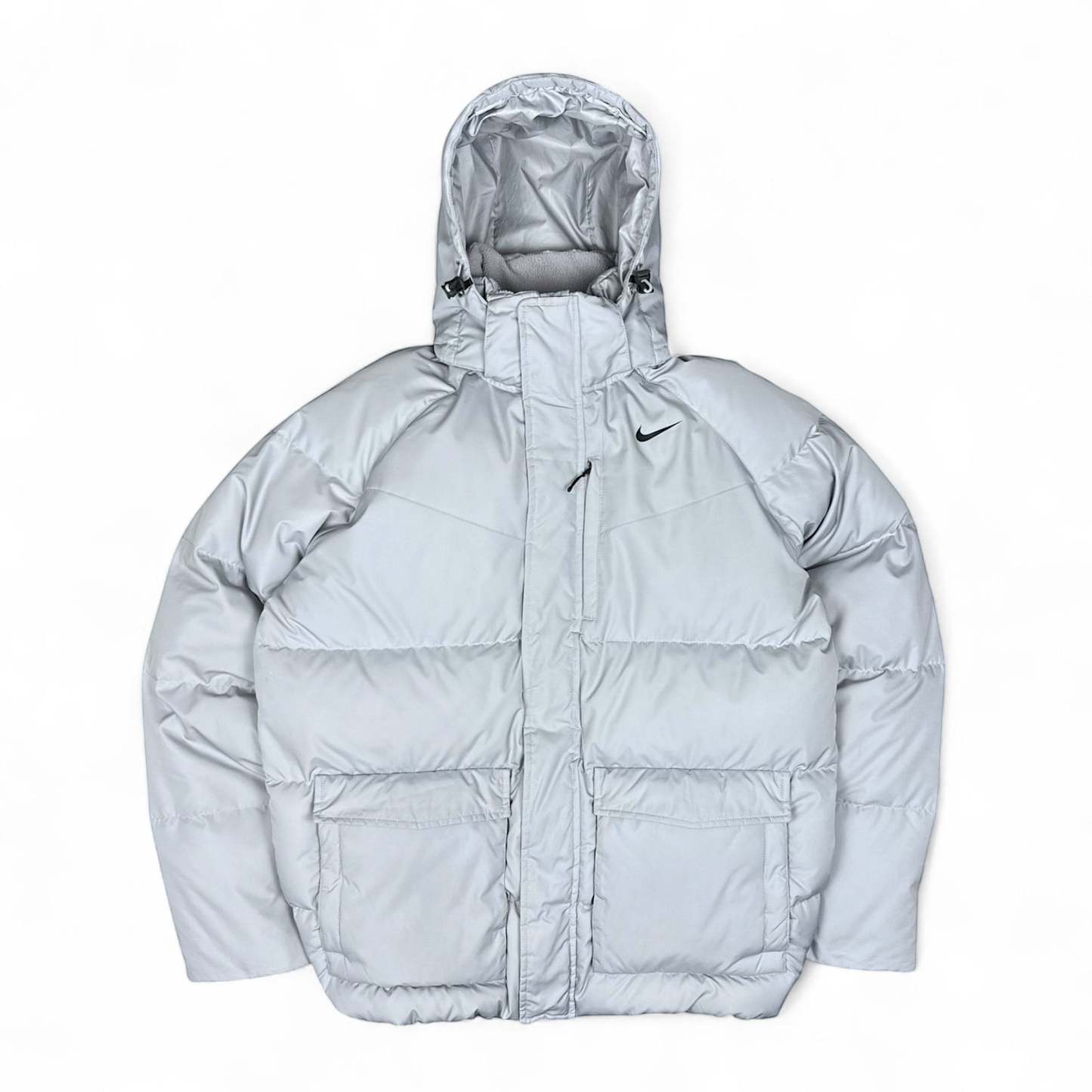 Seltene Vintage-Nike-Daunenjacke in klassischem Beige �C minimalistisch, sportlich und perfekt f��r kalte Tage. Das Modell ��berzeugt mit gesticktem Swoosh vorne und hinten sowie zwei Fronttaschen mit Rei?verschluss.