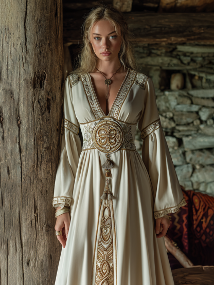 Women's Viking Celtic Knot Rune Art Pattern Cotton And Linen V-neck Dress
